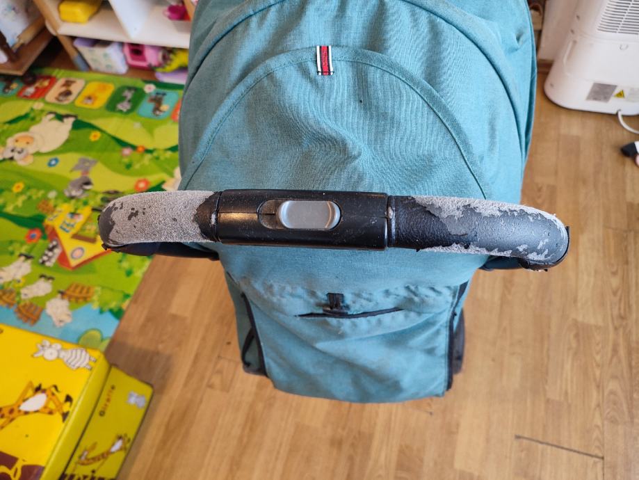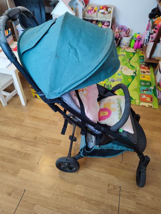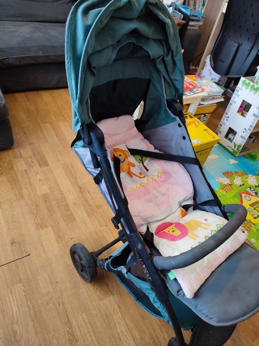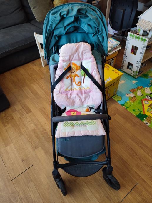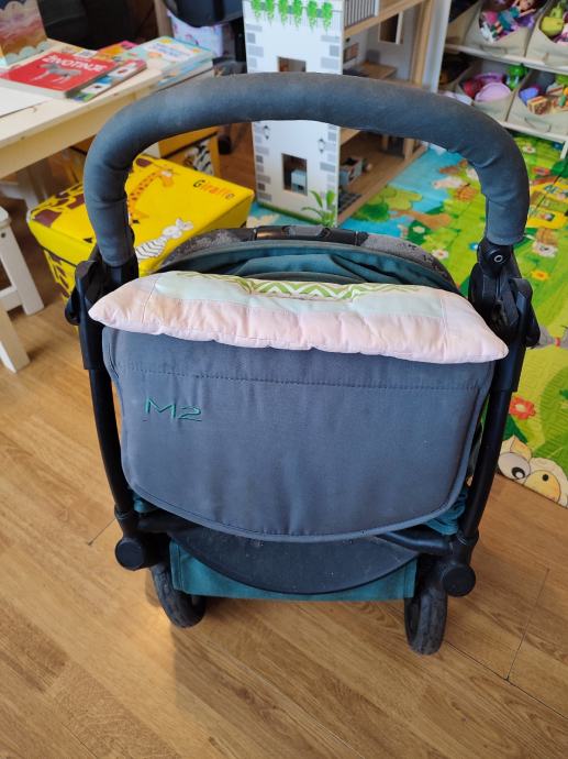 Prodajemo maslinastozelena kisobran kolica mast m2. Kolica se mogu spustiti u lezeci polozaj, ali nisu za bebe od rođenja jer nisu posve ravna. Na kolicima se ogulila rucka (vidi sliku). Uz kolica poklanjamo ljetnu dvostranu žensku podlogu za sjedenje i mrežu protiv komaraca. Moguće osobno preuzimanje u Zagrebu ili Krapini.