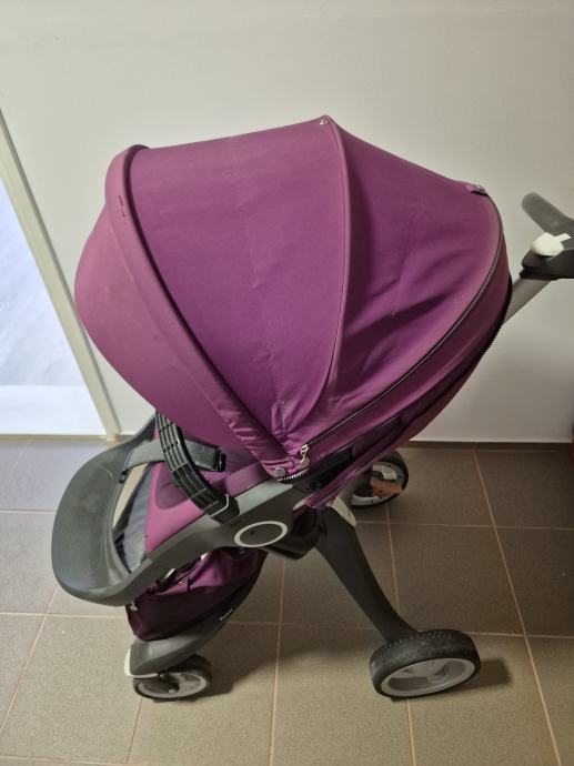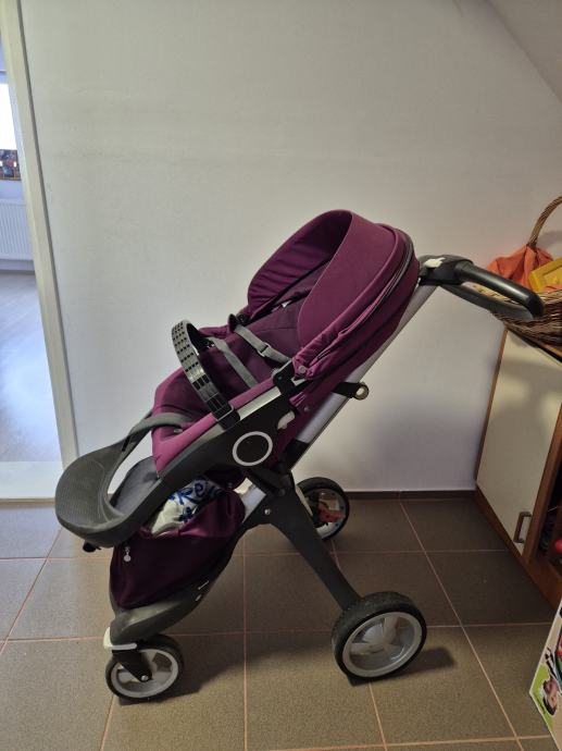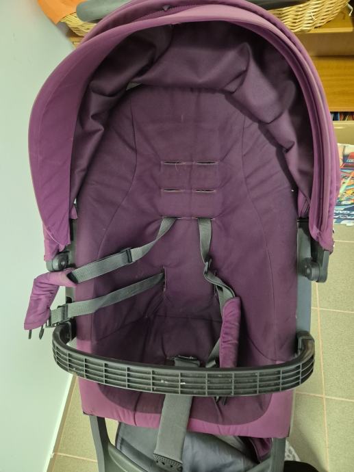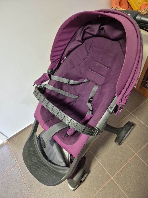 Prodajem dječja kolica Stokke u ljubičastoj boji. Kolica su opremljena sjedalom okrenutim u smjeru vožnje, s peterostrukim sigurnosnim pojasom i podesivim naslonom. Ima proširenu nadstrenicu koja dobro štiti dijete od sunca i vjetra, a ispod sjedala se nalazi praktična polica za pohranu stvari. Okvir je sivi s manjim kotačima sprijeda i većim straga, što omogućuje dobru upravljivost.