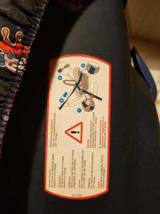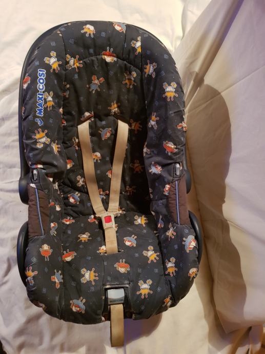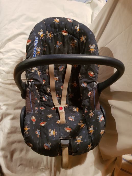 Dječja nosiljka jaje, tamnoplava sa šarenim motivima. Ima pojas s povezanošću u tri točke, a periva presvlaka moze se skidati. Korištena je, ali u dobrom stanju.