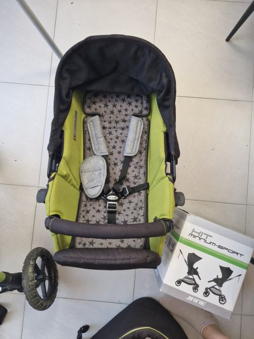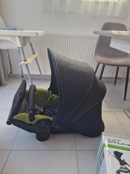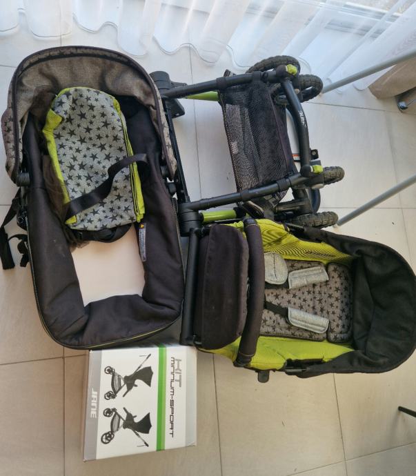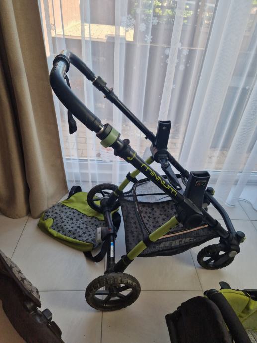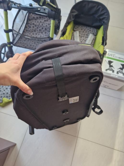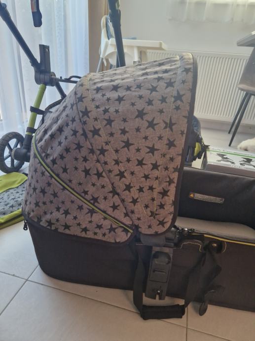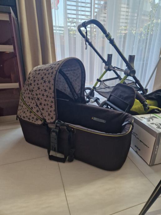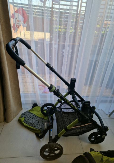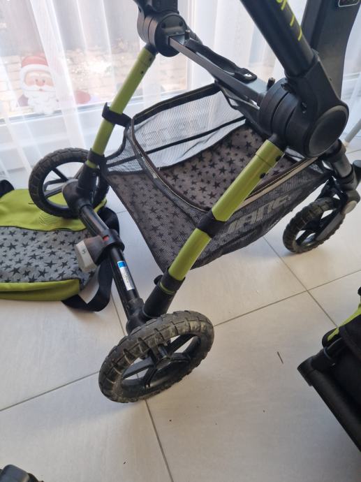 Kolica se sastoje od konstrukcije, kosare za novorođence, sportskog djela. Dodatno ima velike kotače za grublje terene koja su trenutno na konstrukciji, manji kotaci su u kutiji, torbu, zastitu za komarce i zastitu od kiše koja nije na fotografiji. Također gratis iz DMa navlaka za zaštitu od Sunca. Košara ima i navlaku za zimu te podlogu nepromocivu koja moze na oba dijela.