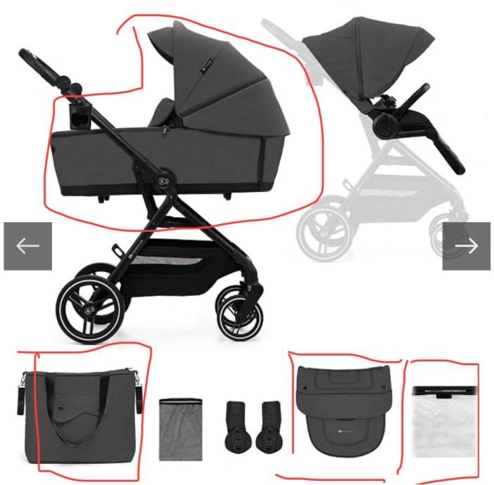 Uz košaru dajem i torbu za kolica, zaštitu od kiše i klasičnu zaštitu, sve označeno crveno na zadnjoj slici. Tkanina ima UPF50+ filter.