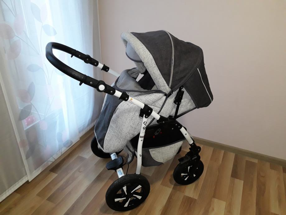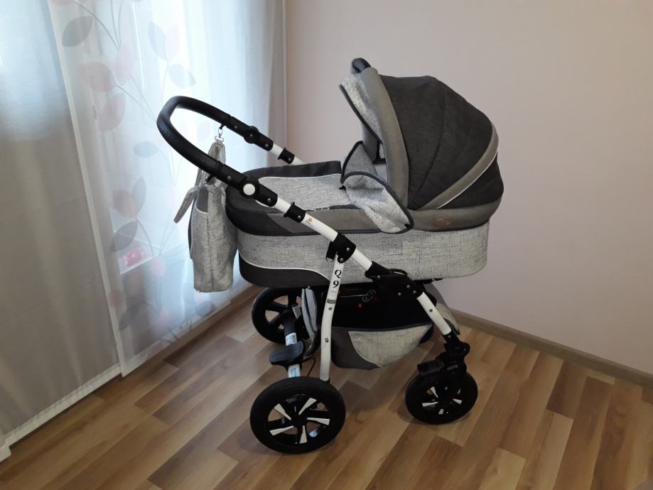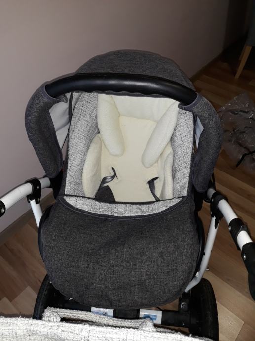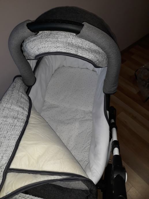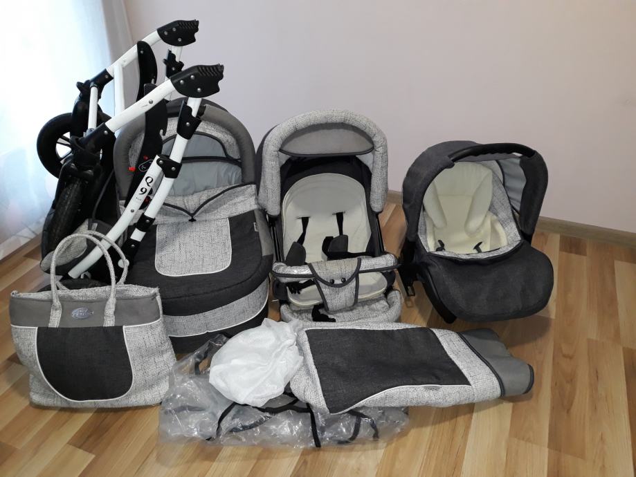 Moderan sustav 3u1 nosiljka (košara), autosjedalica (jaje) za bebe 0-10 kg i sportski dio. Nosiljka je nekorištena. Sva 3 djela imaju zimske navlake.