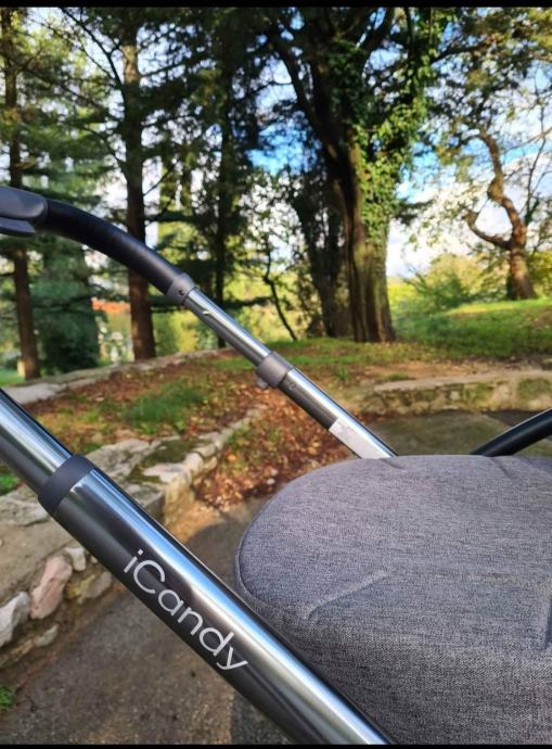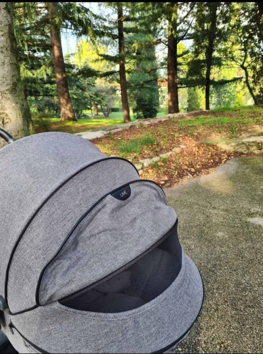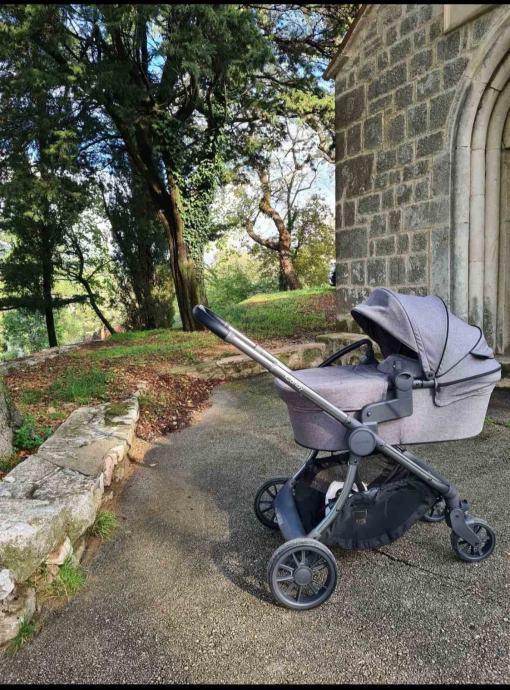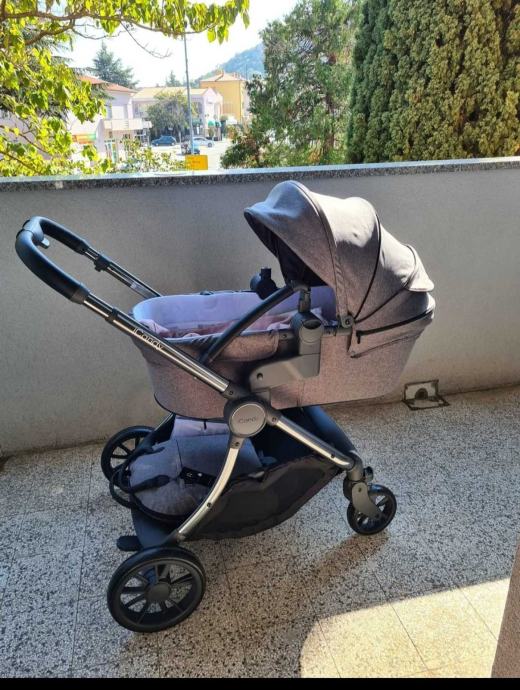 Korištena za jedno dijete, cca 8-9 mjeseci. Jako očuvana. Dolaze sa zimskom vrećom i torbom za pelene.