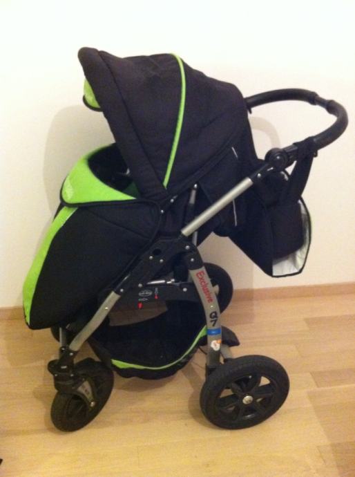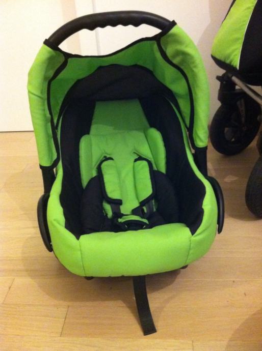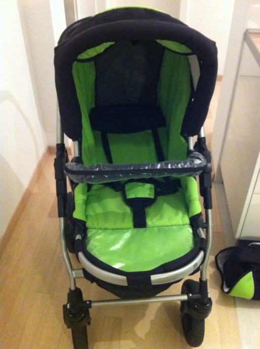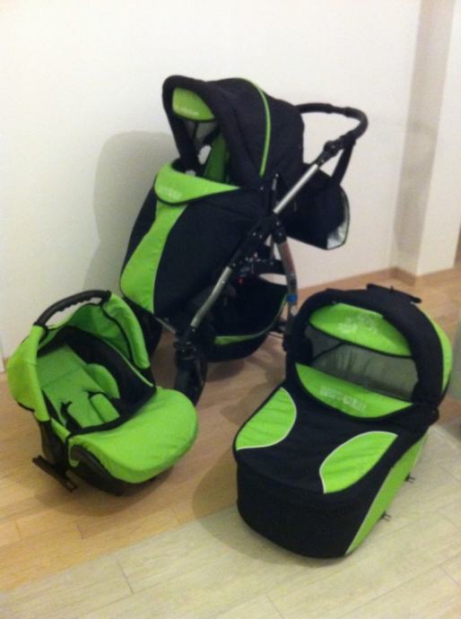 Prakticna i moderna kolica 3 u 1 sastavljena id iznimno lagane aluminijske konstrukcije, nosiljka sluzi kao autosjedalica do 11 kg, materijal otporan na kisu i vlagu, od opreme mreza protiv insekata, presvlaka za zastitu od kise, torba za stvari, kosara za kupovinu, rucka za voznju izradena od imitacije koze, prilagodljiv naslonjac za leda u 4 stupnja. Amortizacijski sistem sa 4 amortizera +2 rezervna kotaca, prednji kotaci se okrecu za 360• . Sklopljena kolica 96+63+29cm. Kao nova !