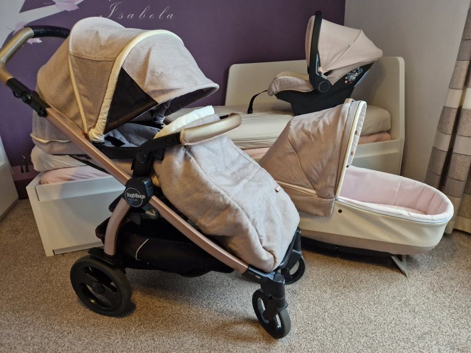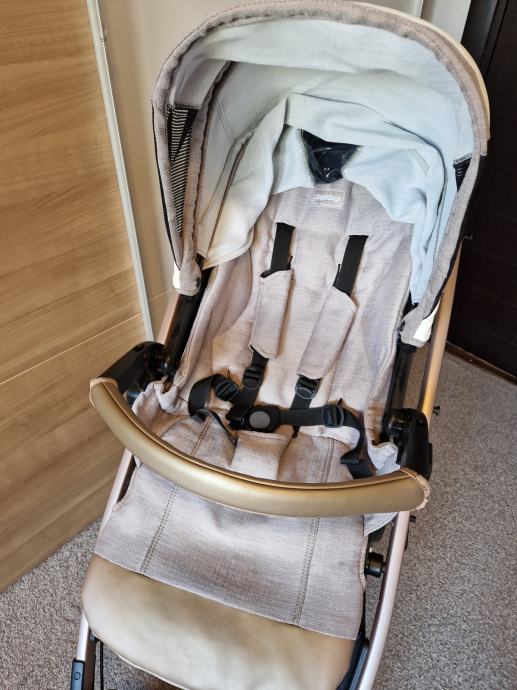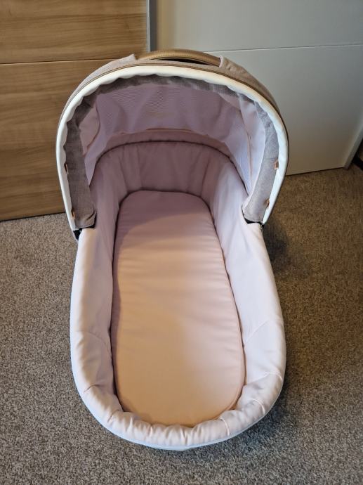 Kolica sadrže košaru za novorođenče, sjedeći dio i auto sjedalicu.