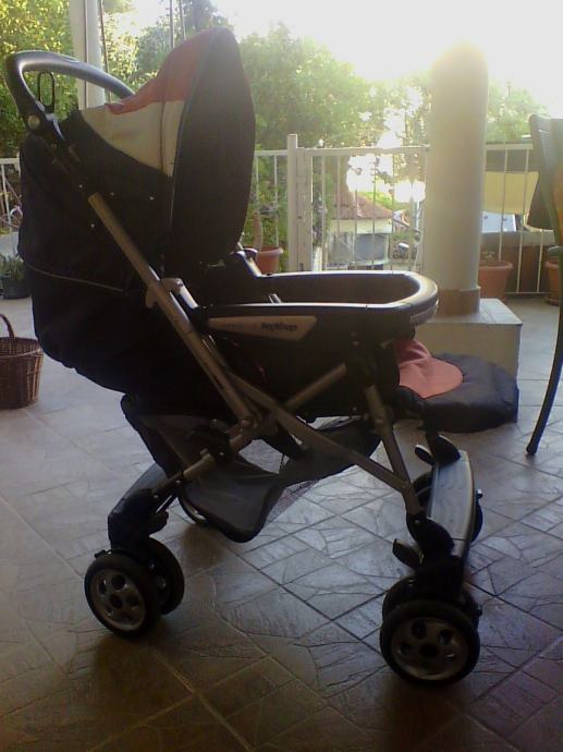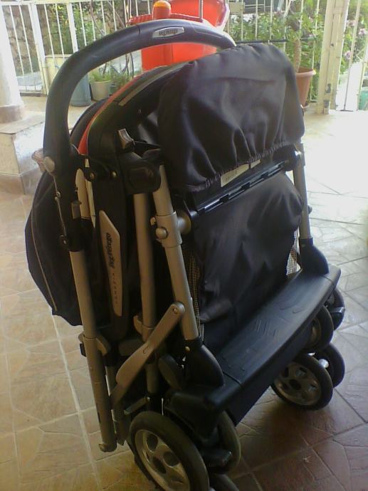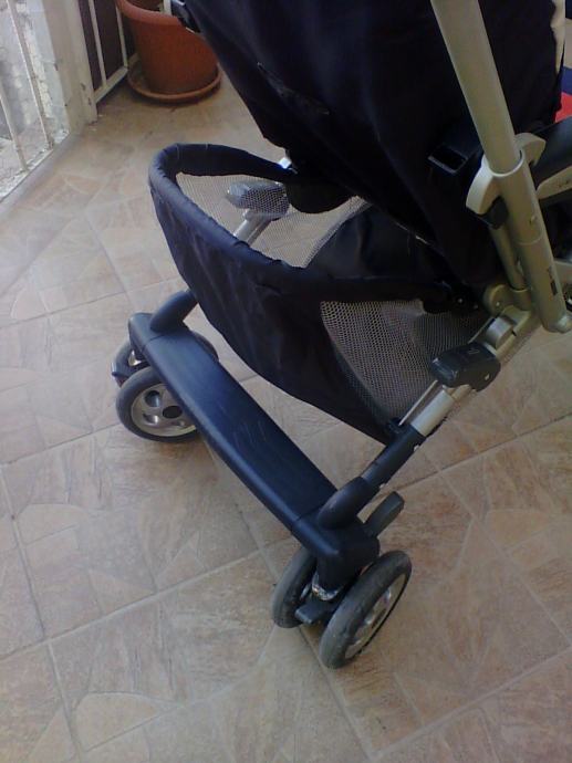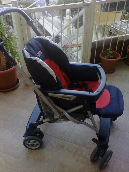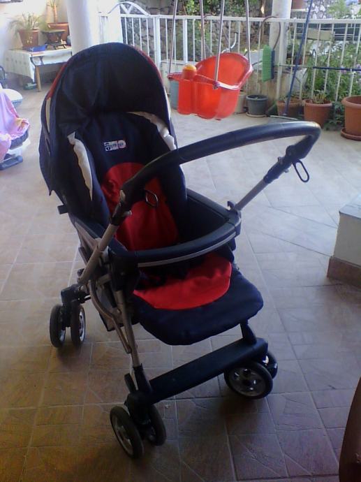 Modro-crvene navlake se lako skidaju, te su perive u perilici. Kolica imaju tzv. "nulti" polozaj pa se u njima mogu voziti bebe od prvog dana. Lako se sklapaju, lako upravljanje, jer se svi kotaci mogu okretati, a rucka se moze prebacivati na obje strane. Iza je velika kosara za stvari, te nogostup za starije dijete. Uz kolica idu i zimska navlaka za noge, te plasticni nastavak za casu kad je dijete starije.
