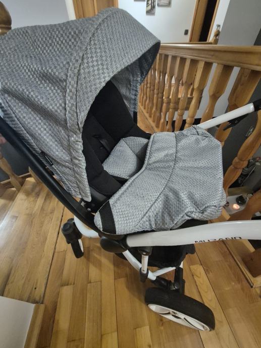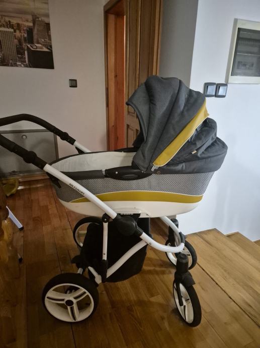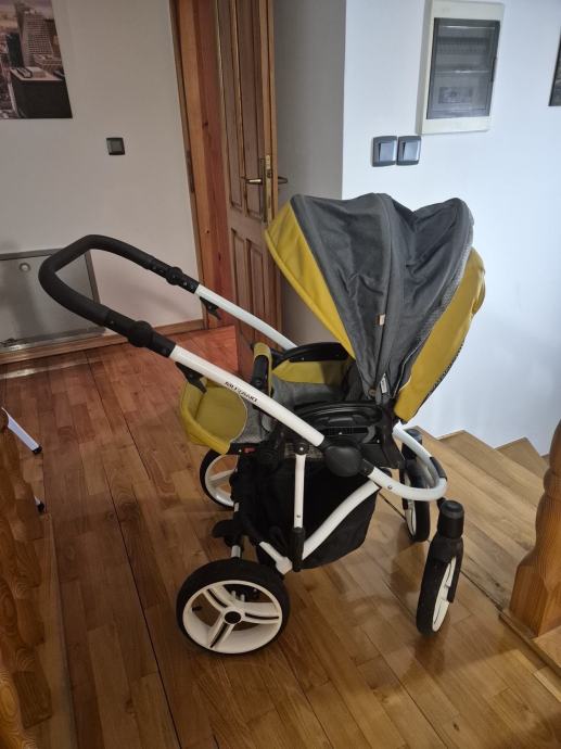 Prodajem Bebetto kolica 3u1 u sivoj boji sa žutim detaljima. Kolica imaju mogućnost promjene smjera sjedala, što znači da dijete može gledati prema roditeljima ili prema naprijed.