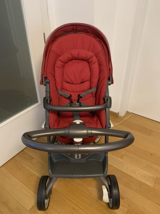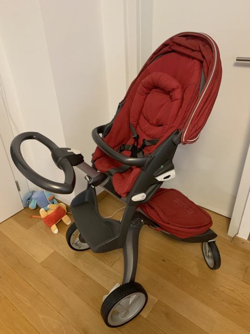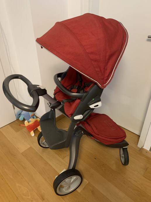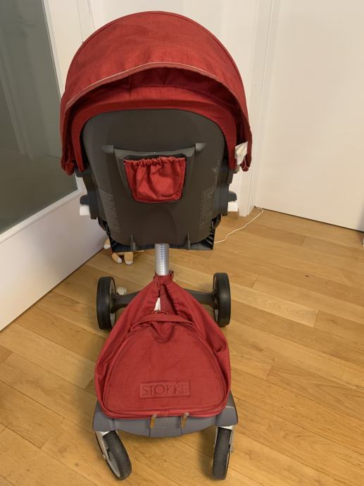 Dječja tamno crvena STOKKE XPLORY kolica s košarom i sigurnosnom prečkom, sa zaštitnom ceradom protiv kiše, zaštitnom mrežom protiv komaraca, nastavkom za suncobran i dodatnom torbom na kolicima, očuvana kao nova, prodajem.