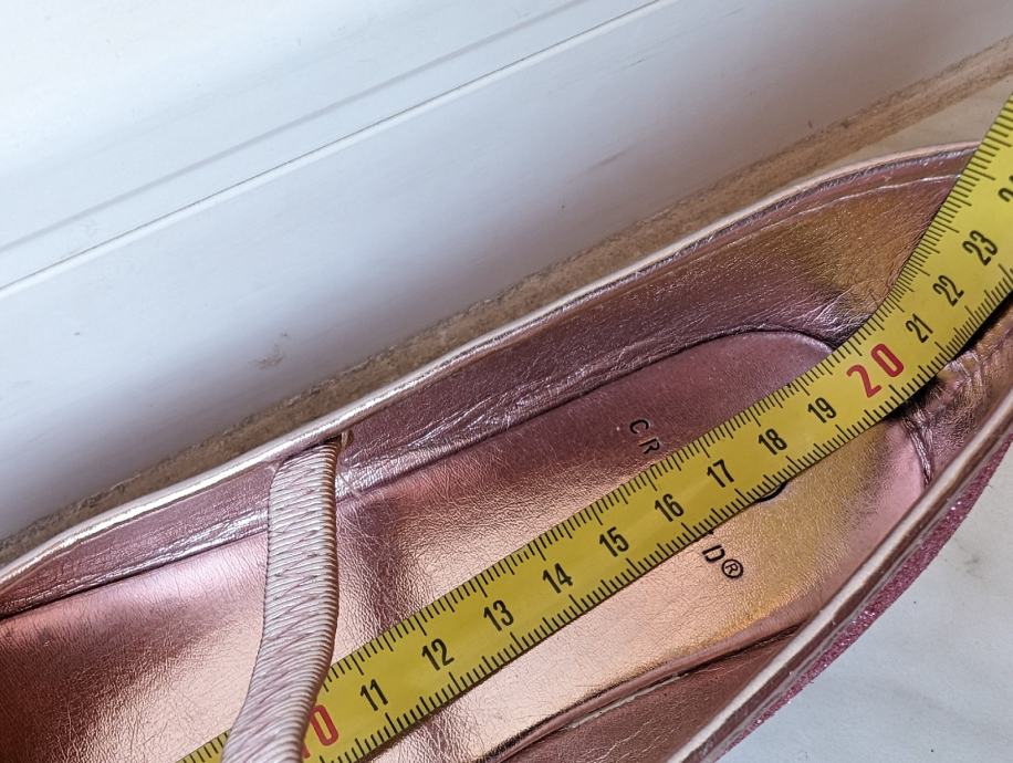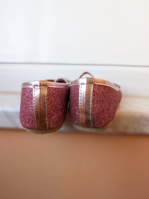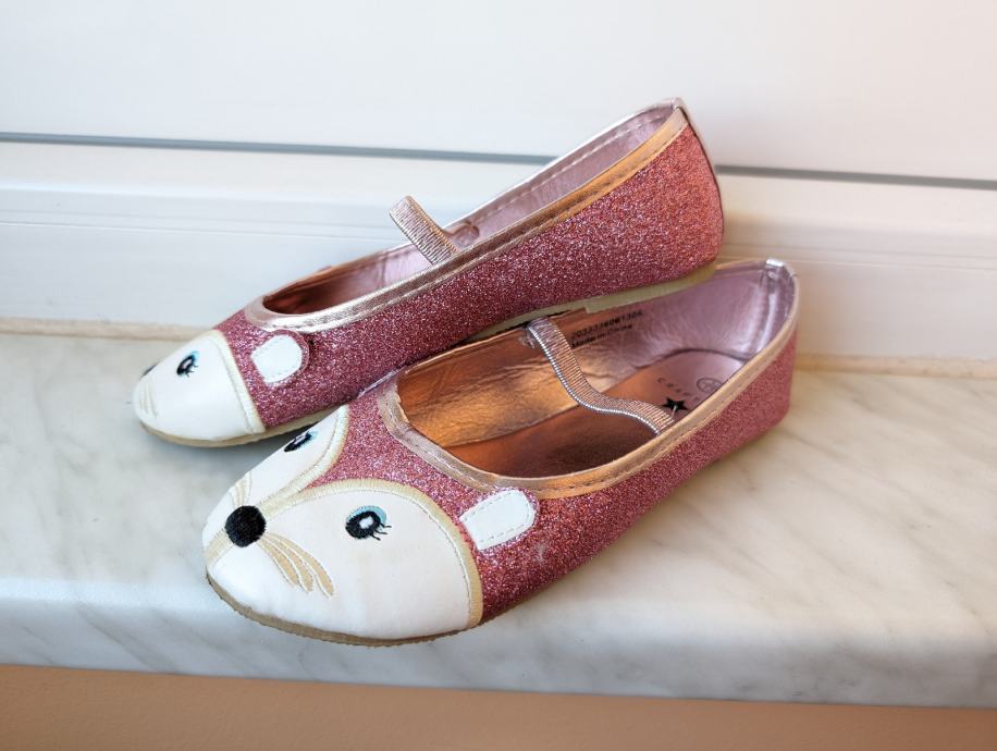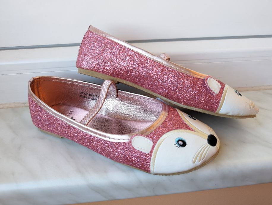 3. H&M balerinke br. 32, svjetlucave roze s likom životinje, očima, uhekima, jako slatko stoje. Lijeva ima sitno oštećenje naprijed (uslikano je), ali se ne vidi jako kad se nose, cijena 8 eura.