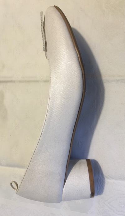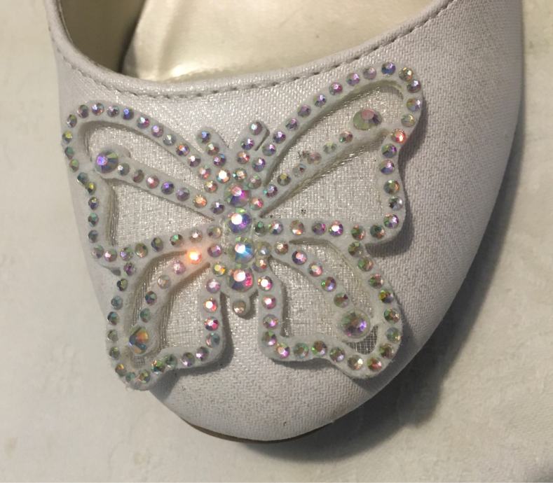 Elegantne bijele cipele za svečane prilike. Broj 36. Izvana svjetlucava tkanina, dolje umjetni materijal. Imaju peticu od gotovo 4 cm. Potpetica je neobična budući da je potpuno okrugla, tj. u formi valjka, promjera 4,5 cm. Naprijed ukras u obliku leptira, od štrasa (kristalića), koji se pod osvjetljenjem presijavaju u raznim bojama. Nizovi kristalića, koji oblikuju leptira, povezani tankom prozirom mrežicom.