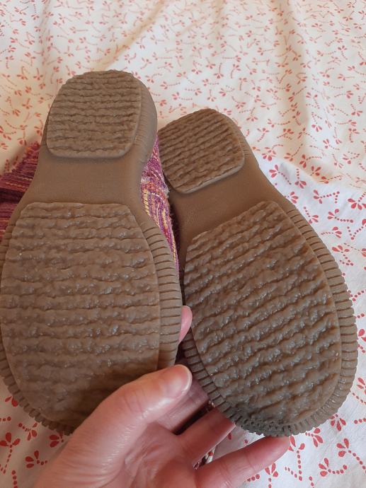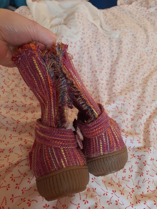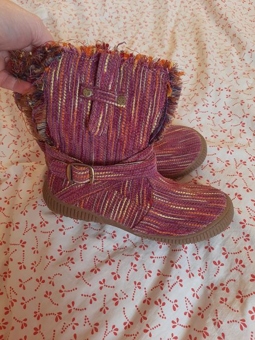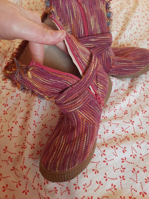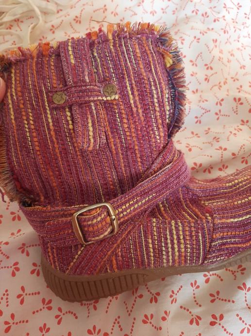 Potpuno nove nikad nošene dječje čizmice od tekstila. Vrlo atraktivne i moderne za nošene na razne kombinacije. Vel. 35. Na desnoj čizmi zbog selidbe oštećenje gumenog đona koji se ne primjeti kad se hoda (poslikano).