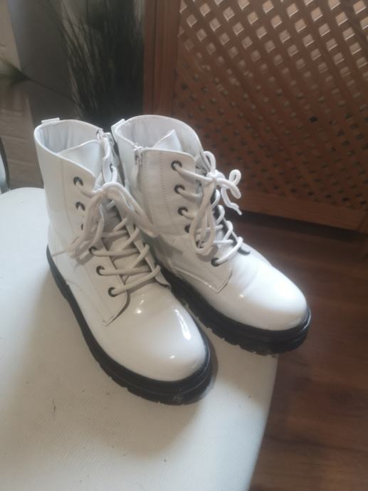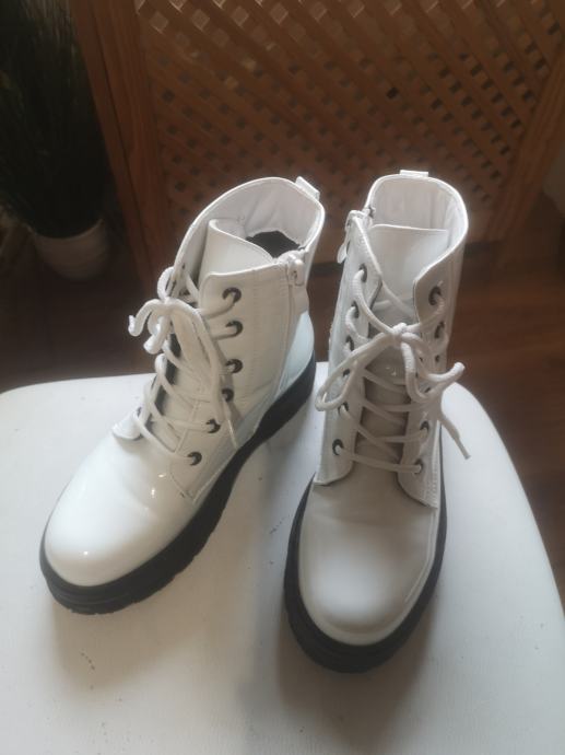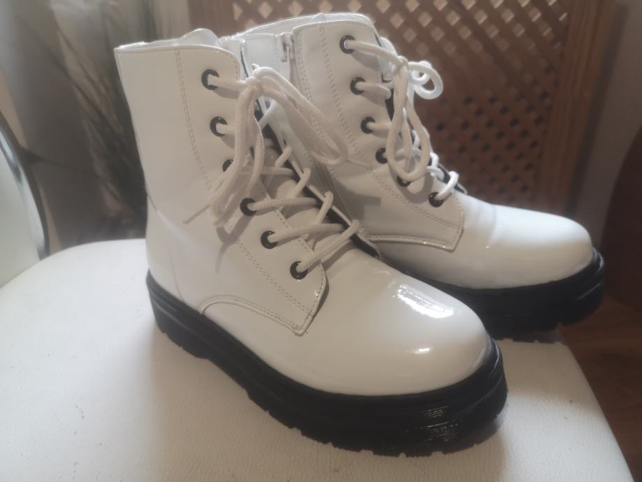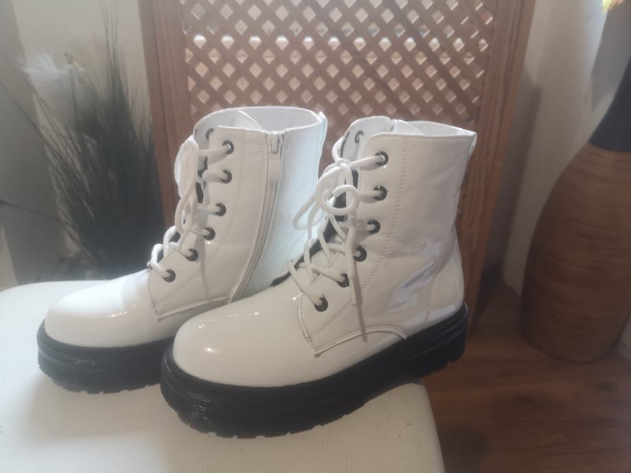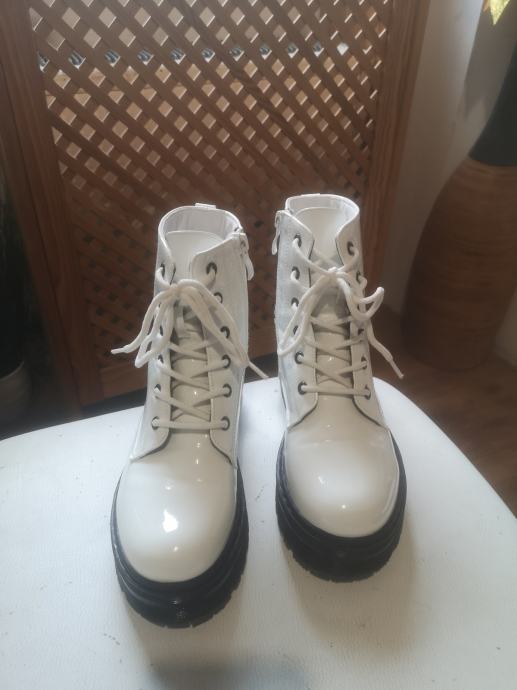 Prodajem dječje čizme u bijeloj lak izvedbi, veličine 33. Kao novo, jednom nošene. Radi se o modelu s vezicama i bočnim patentnim zatvaračem, na masivnijoj crnoj platformi. Gornji dio je od lakirane umjetne kože.