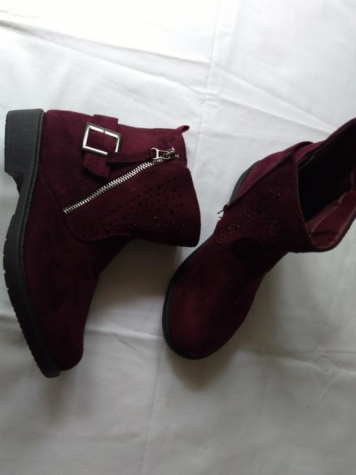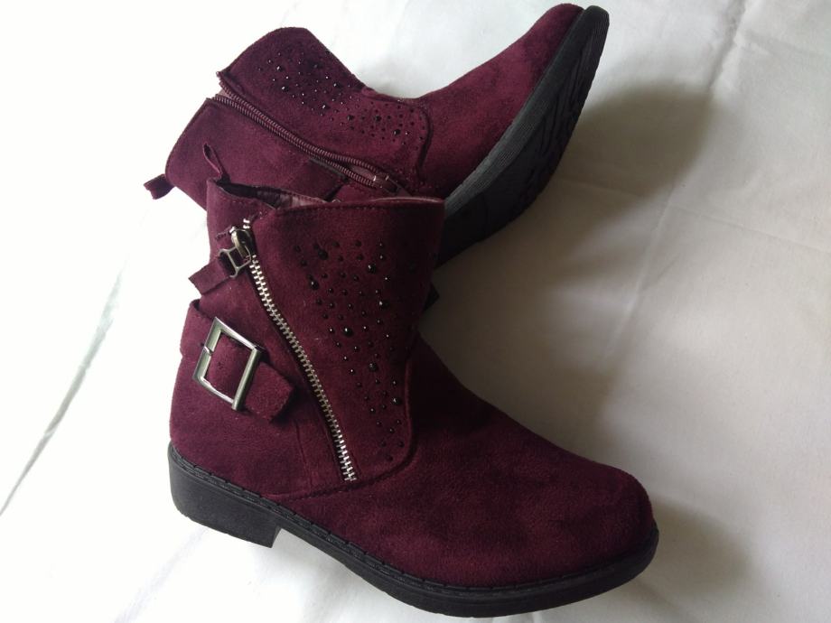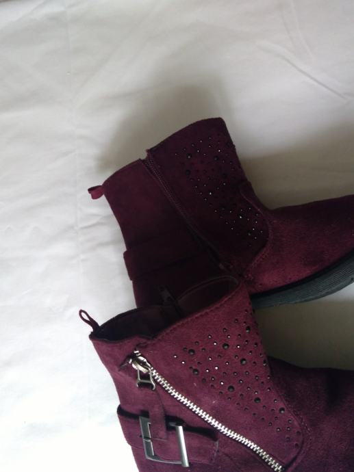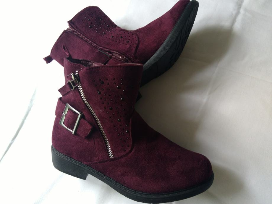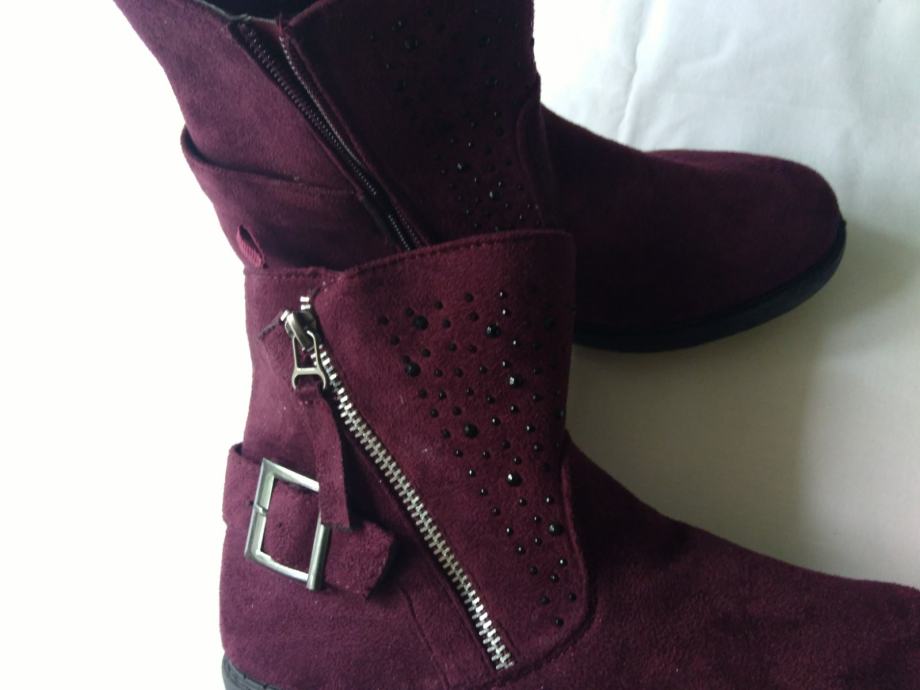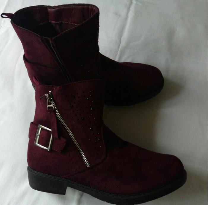 Potpuno nove, lijepe bordo boje, sa šljokicama u gornjem dijelu, ugodne, kopčanje zipom s unutarnje strane, izvrsne!