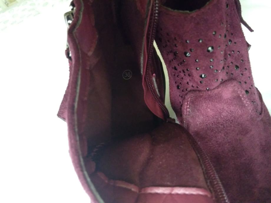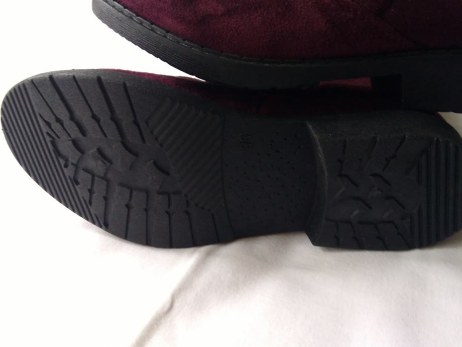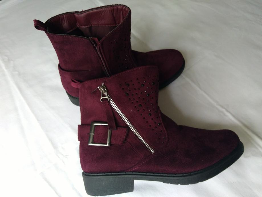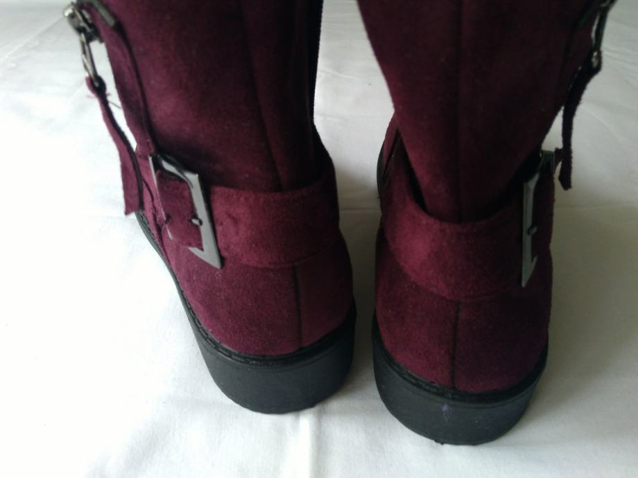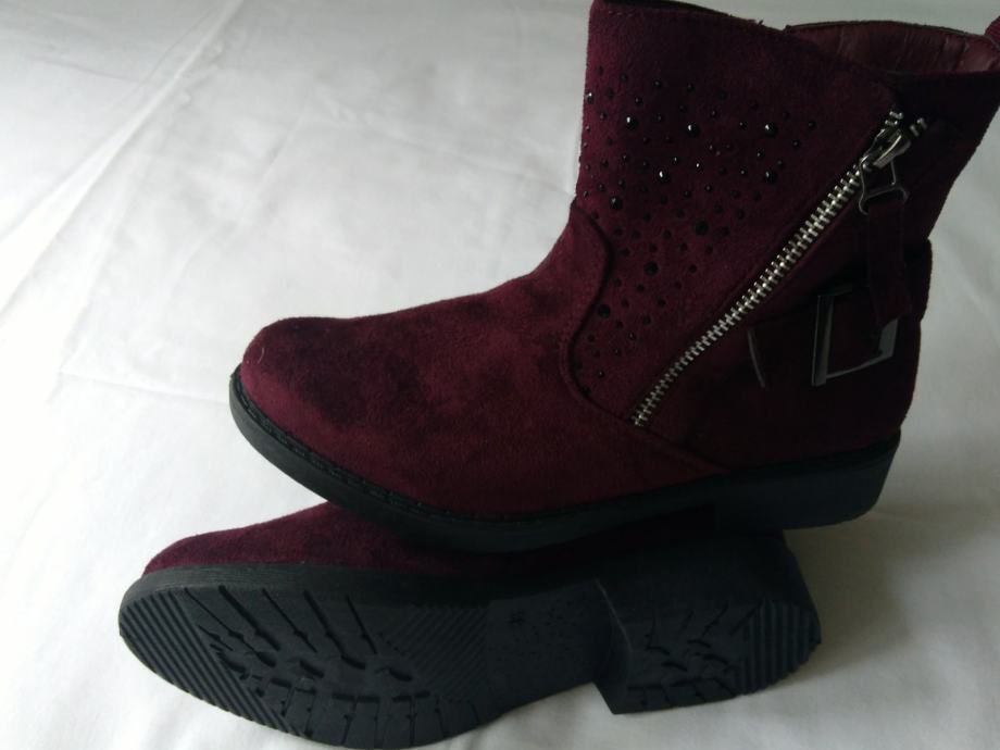 Potpuno nove, lijepe bordo boje, sa šljokicama u gornjem dijelu, ugodne, kopčanje zipom s unutarnje strane, izvrsne!