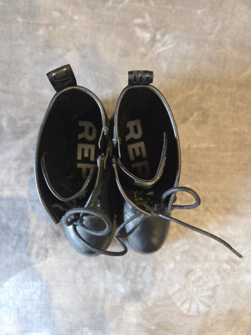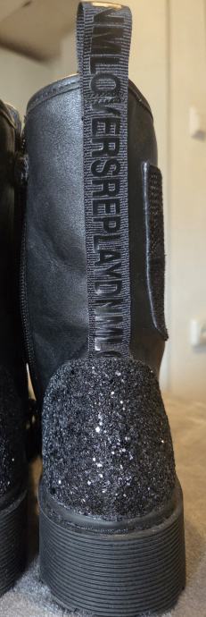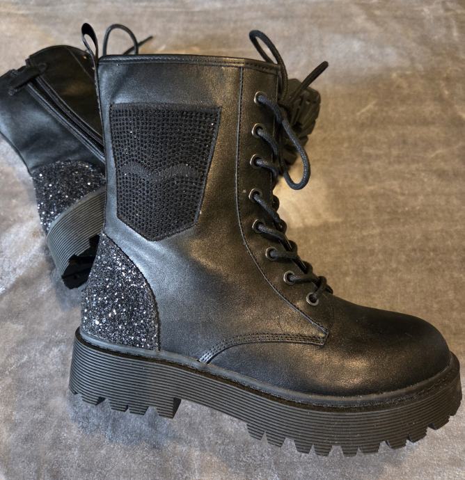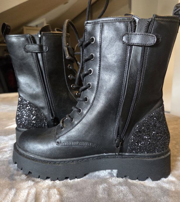 Moderne gležnjače sa urbanim stilom, crne, materijal je od kvalitetne umjetne kože, deblji potplat (4cm), s unutarnje strane je patent za lakše obuvanje, sprijeda vezice. Suptilni detalji straga i bočno podižu top izled. Broj je 38 ali preporučujem ju kao manji 38, više kao 37,5 po duljini.Nenošene.
