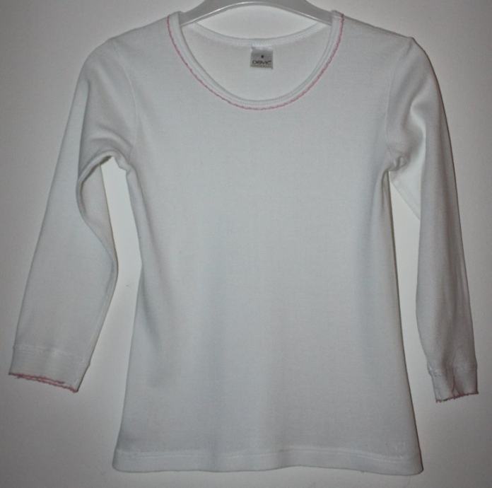 Bijela pamučna potkošulja dugih rukava, vel. 6, Dević, tanji pamuk. Potkošulju smo uglavnom nosili kao majicu ispod nekih tunika bez rukava. Očuvana je i može se još iskoristiti.