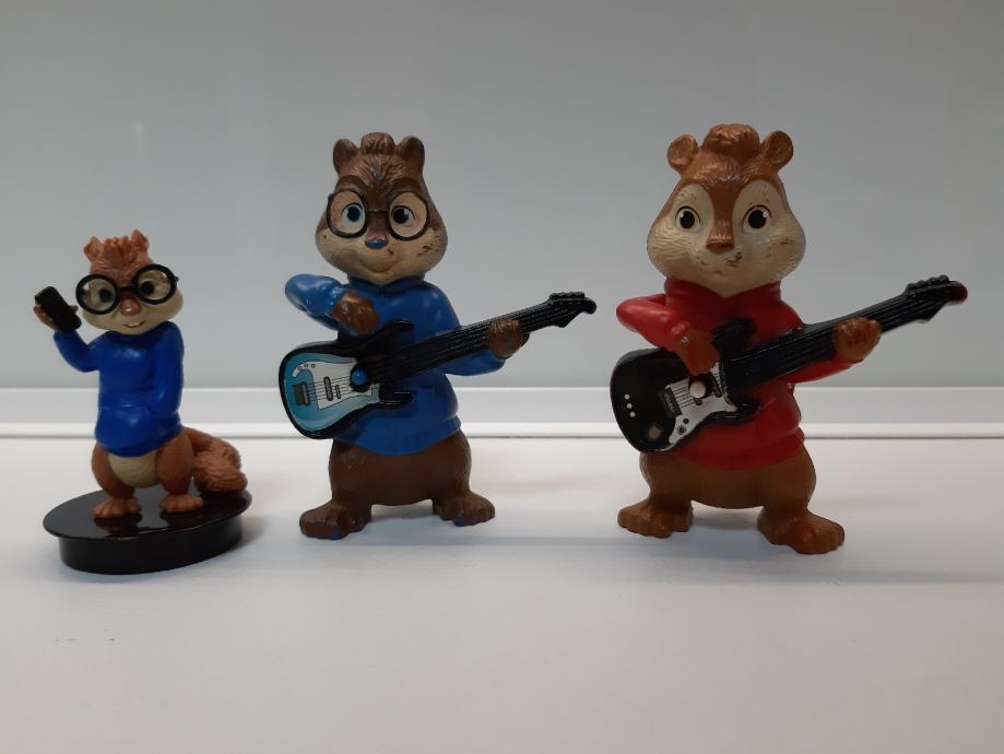 Set od tri figurice iz crtića Alvin i vjeverice. Dvije su 12 cm a treća je 10cm. U dvije veće se stavljaju i baterije.