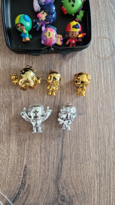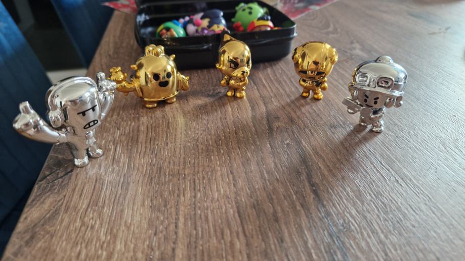 Prodajem tri zlatne i dvije srebrne figure sa slike Brawl stars za 160 EUR kupljene u Hrvatskoj po paketićima u Mulleru.