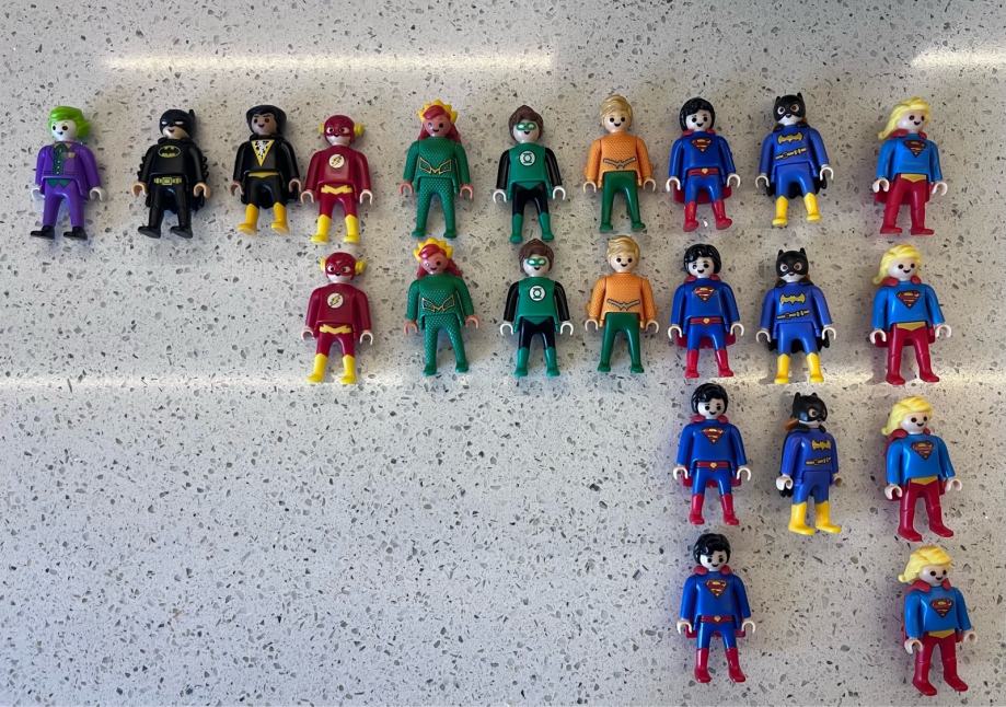 Dostupno je više komada pojedinih likova (vidljivo na slici – ima duplih Flash, Aquaman, Superman, Supergirl i dr.).