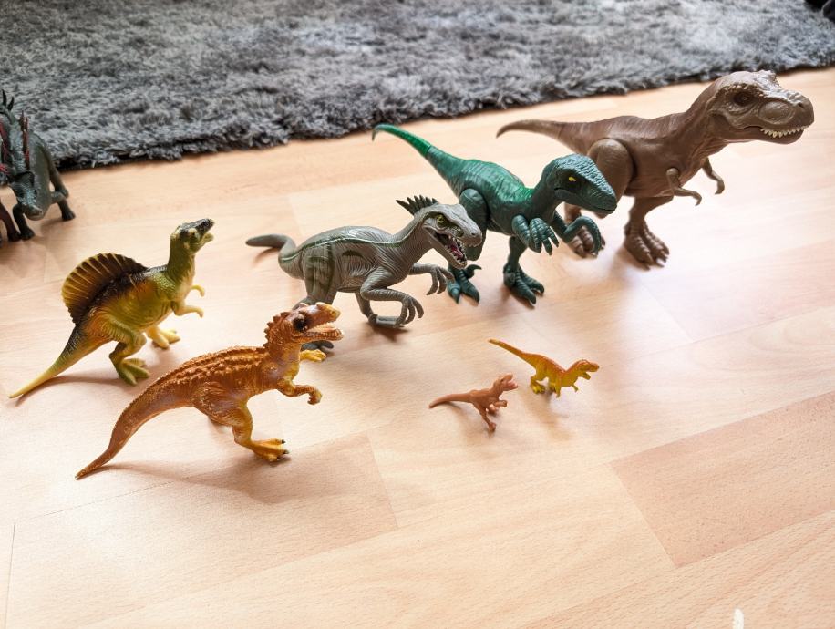 Među figurama su i tri dinosaura koji se glasaju, jedan veliki triceratops, kao i velociraptor i T-rex koji ispuštaju zvukove i otvaraju usta kad im se pomiče zadnja noga (molim vidjeti zadnje dvije slike).