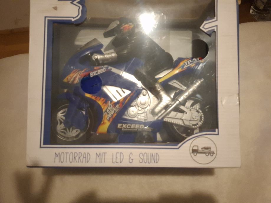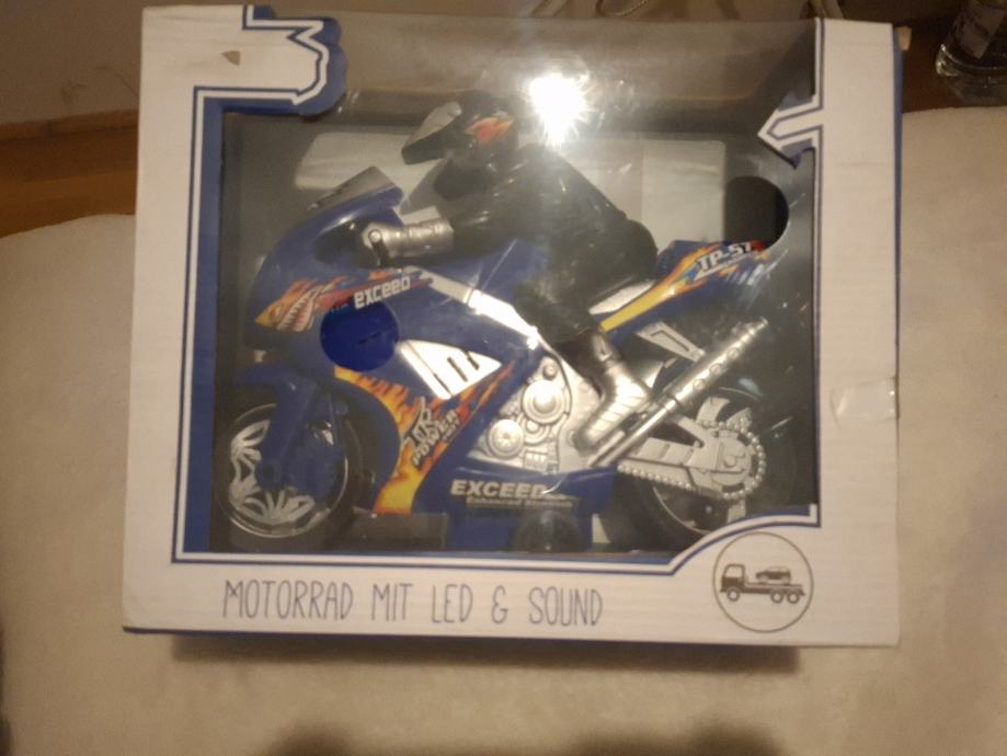 Prodajem novu dječju igračku motocikla u plavoj boji s narančastim detaljima. Radi se o modelu Exceed koji dolazi s LED svjetlima i zvučnim efektima. Nova je, nekorištena.