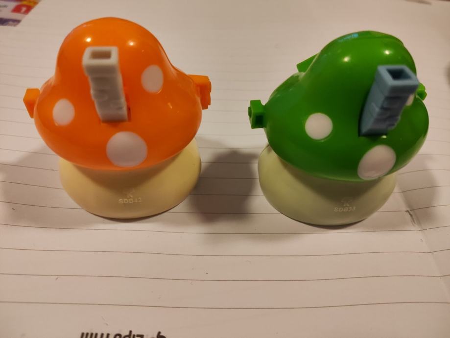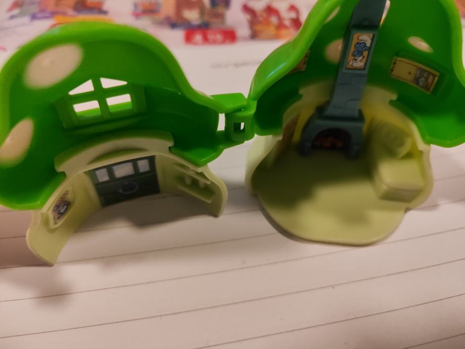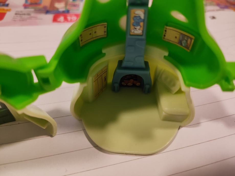 izdubljene u narančastoj i zelenoj gljivi , otvaraju se tako da se vidi unutrašnjost, u kućici je kamin, i fotografija Štrumpfa i Štrumpfete.