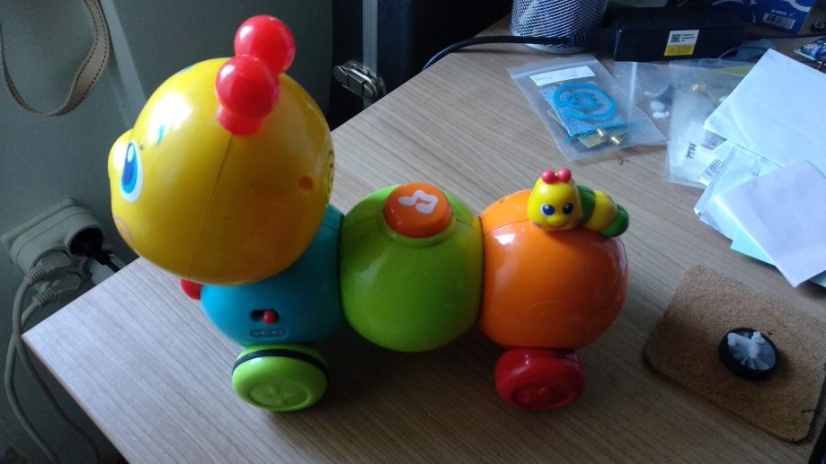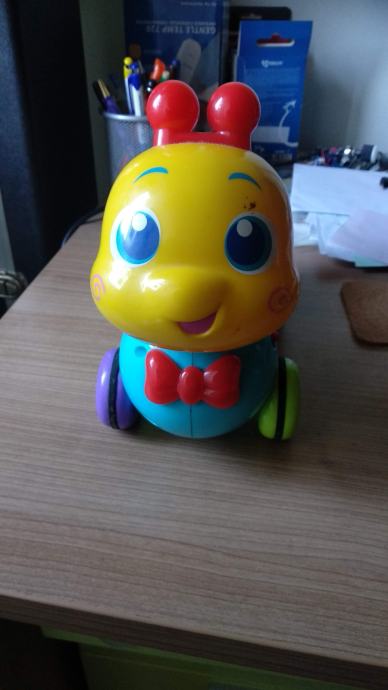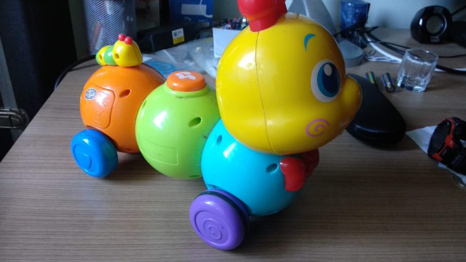 Darujemo igračku gusjenice na kotačima sa živopisnim bojama. Nekada se na pogon baterija stezala i istezala, uz daljinski upravljač. Od uporabe se njeno gibanje pomoću daljinskog potrošilo, ali još uvijek je za malu djecu dobra za obično guranje rukom pomoću kotača.