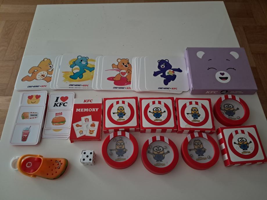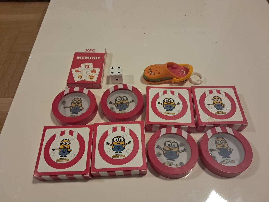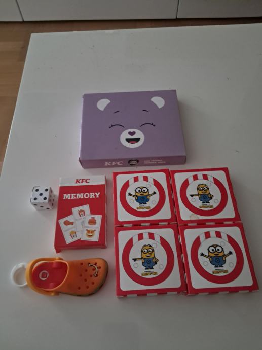 Igračke MINIONS 4x , Memory KFC društvena igra, privjesak za ključeve u obliku sandale, kocka
