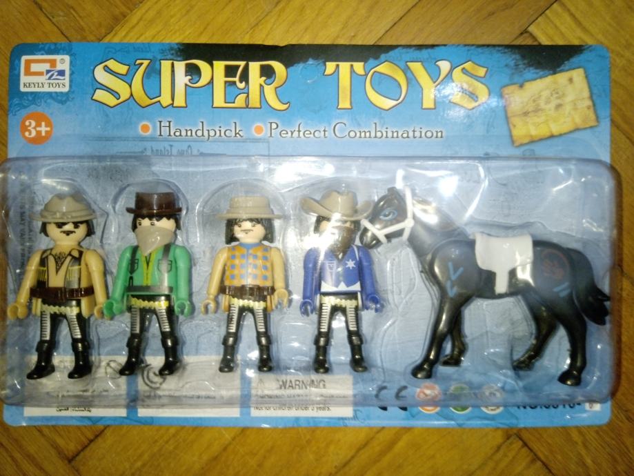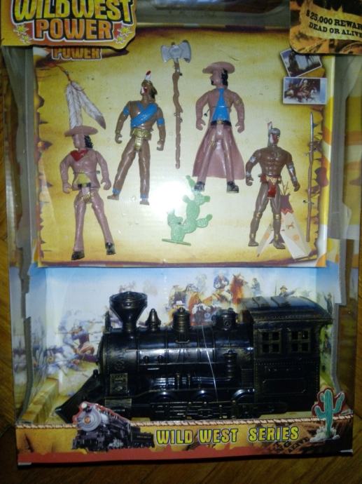 SET 1 i 2 : indijanci i kauboji visina 9 cm, pomični udovi, konj 11 x 8 cm ; SET 3 WW : kaubojka, kauboj, dva indijanca sa oružjem, kopljem i tomahawkom, te lokomotiva i kaktus 6 cm visok, figurice sa pomičnim udovima, visina 11 cm, lokomotiva 23 x 11 cm, glanc neotvarano u kutiji,