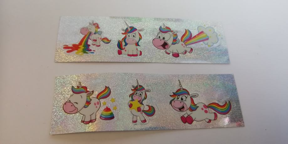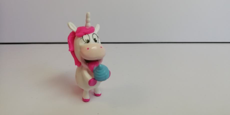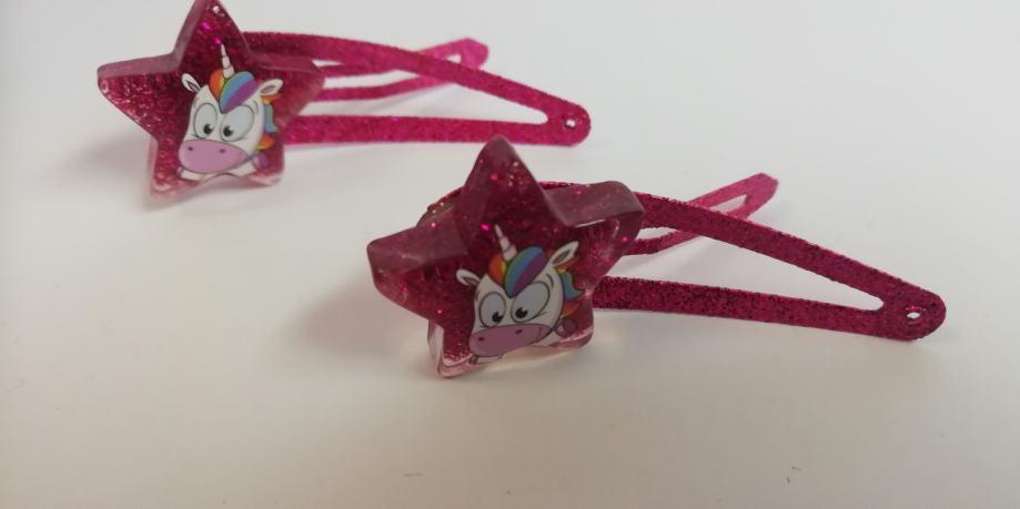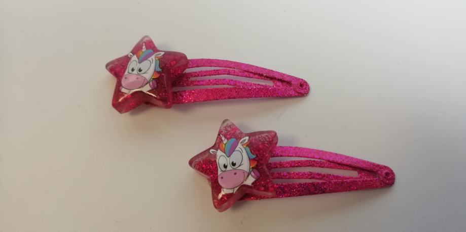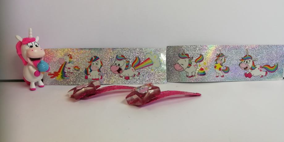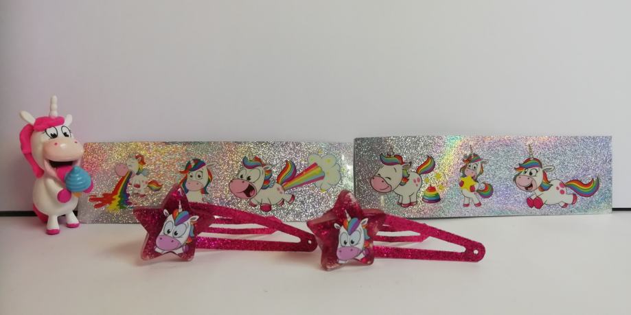 dvije šljokičaste roze špangice, figuricu jednoroga koji drži sladoled u kopitima te dva lista naljepnica na jednoroge.
