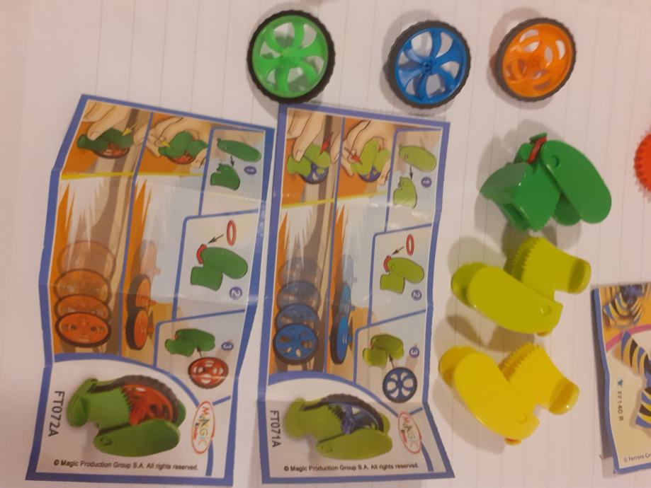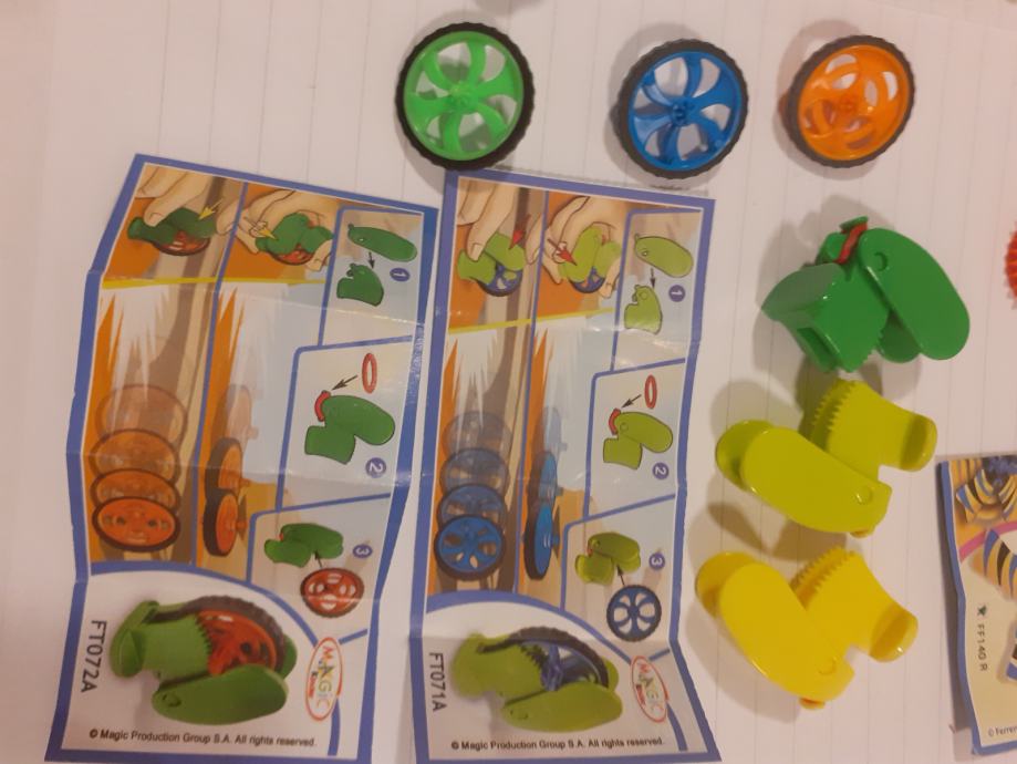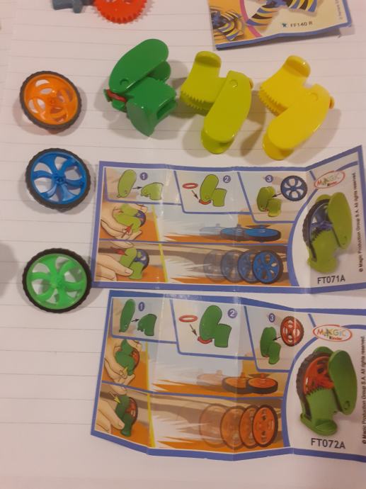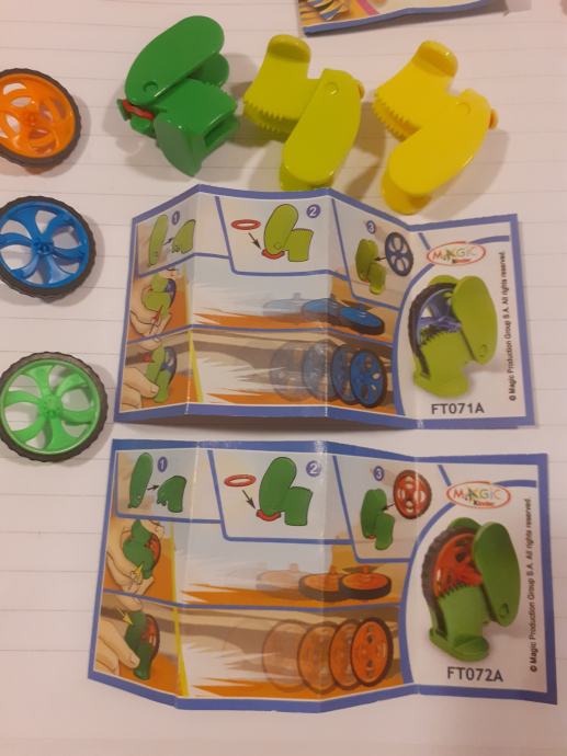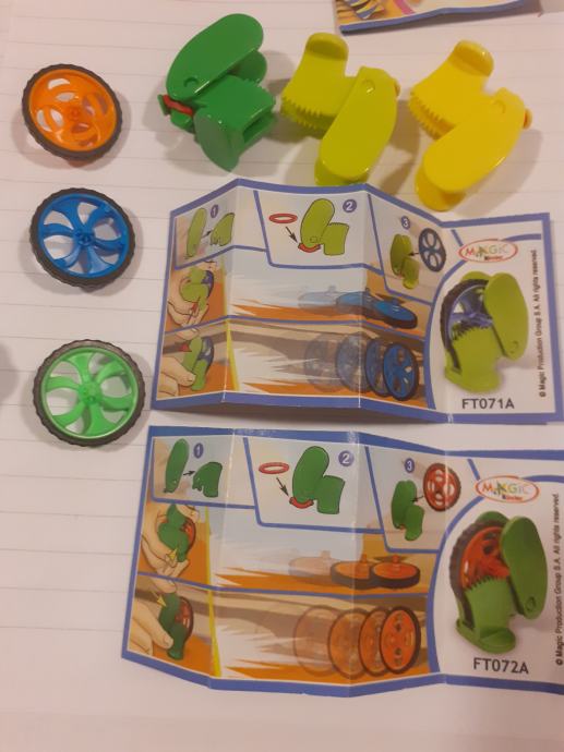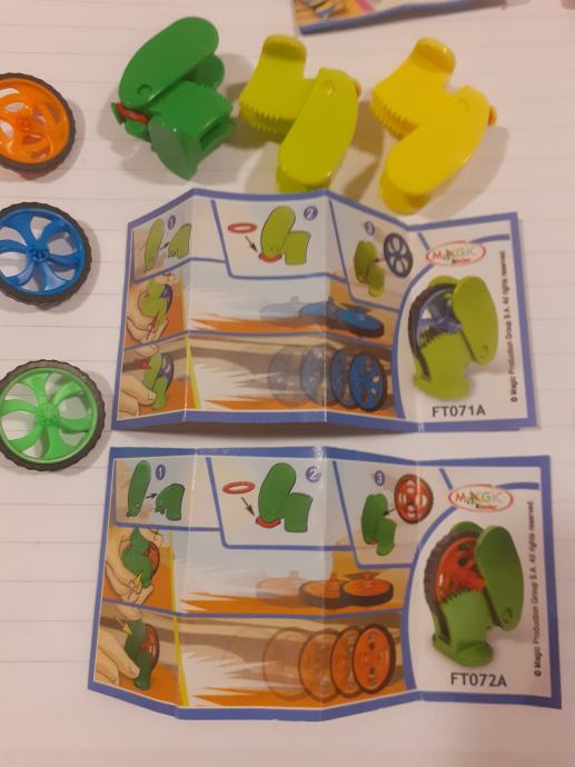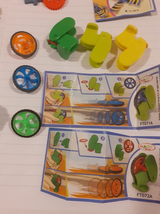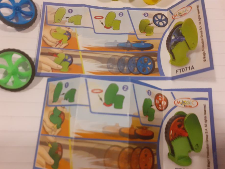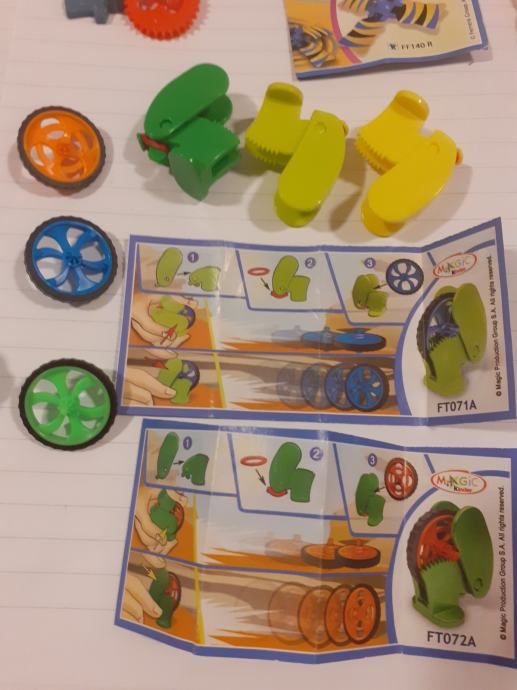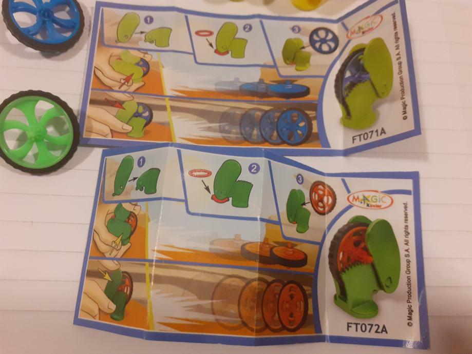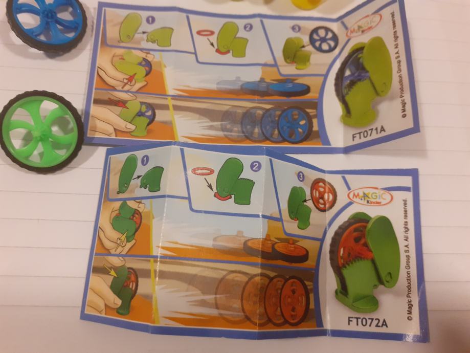 Igračka je dio kolekcije igračaka iz Kinder jaja.Na slici su prikazani različiti dijelovi igračke, uključujući kotače i upute za sastavljanje.Model igračke je FT071A.