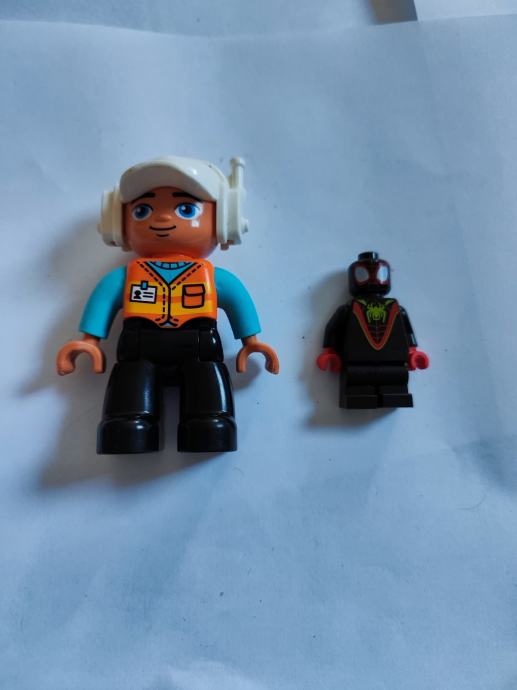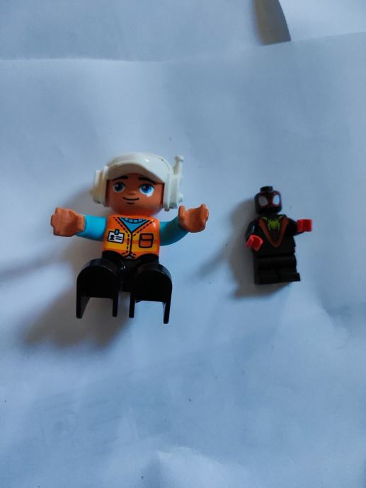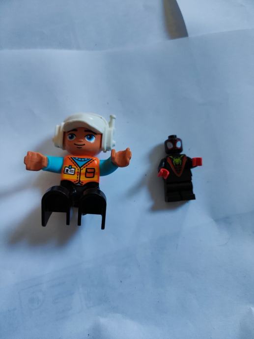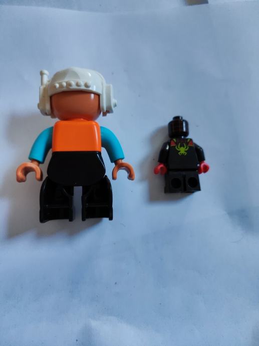 Prodajem Lego Duplo figuricu i Lego Superhero DC figuricu. Duplo figurica ima bijelu kacigu i plavi kostim s narančastim detaljima, a DC figurica je manja, crna s crvenim i zelenim detaljima. Obje figurice su u dobrom stanju i spremne za igru ili proširenje postojeće kolekcije.