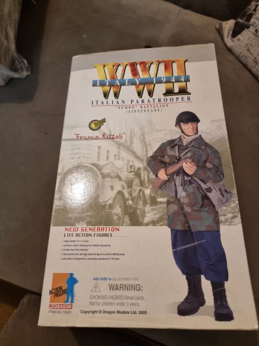 Kolekcionarska figura/lutka WW2 vojnika. Talijanski padobranac sa dodatnom Njemačkom uniformom i opremom za prikrivanje prilikom napada.