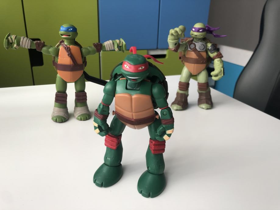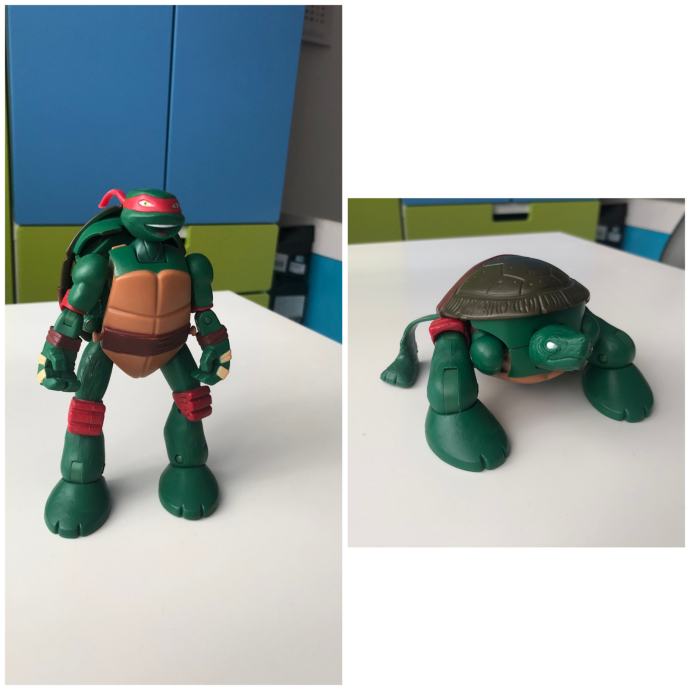 Aktivne figurice ninja kornjača. Jedan ispucava štapove, drugi radi zvijezde a treći se pretvara u kornjaču.