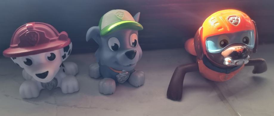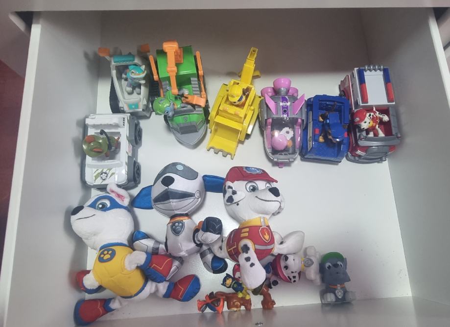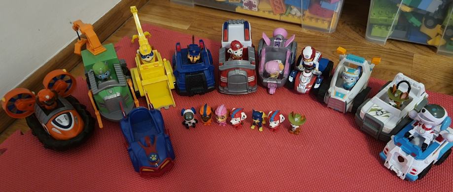 Prodajem sve šta imamo od Psića u ophodnji, 3 plišanca - Ryder, Marshall i Robodog, 11 vozila sa figuricama, nekoliko manjih figurica te đungla. 3 figurice za vodu, Zuma na navijanje, gumeni Marshall i Rocky. Apolo super pas sa vozilom koji svira i Robo dog sa vozilom koji svira su odlične kopije sa eBaya, ali sve drugo je orginal, kupljeno u Mulleru većinom, čitavo, funkcionalno i očuvano, jedino plastična figurica Rydera lijepljena, ima slika.