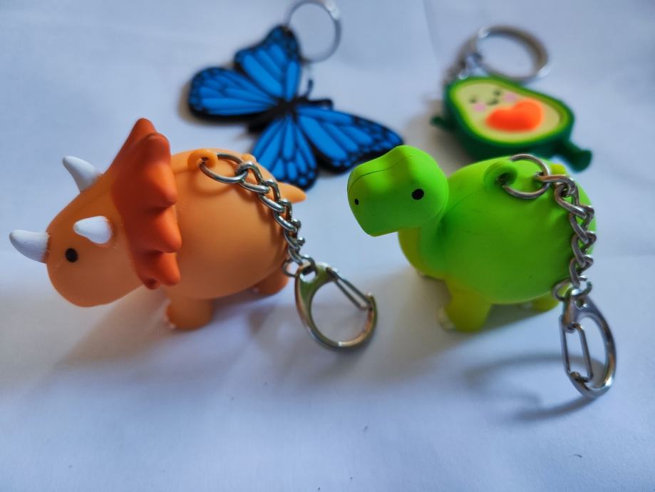 Prodajem set od 4 privjeska za ključeve. U setu se nalaze dva dinosaura – narančasti triceratops i zeleni dinosaur – zatim plavi leptir te privjesak s avokadom. Dinosauri su izrađeni od mekše gume i nešto su veći od preostala dva privjeska koji su ravni i također gumeni. Svi četiri dolaze zajedno.