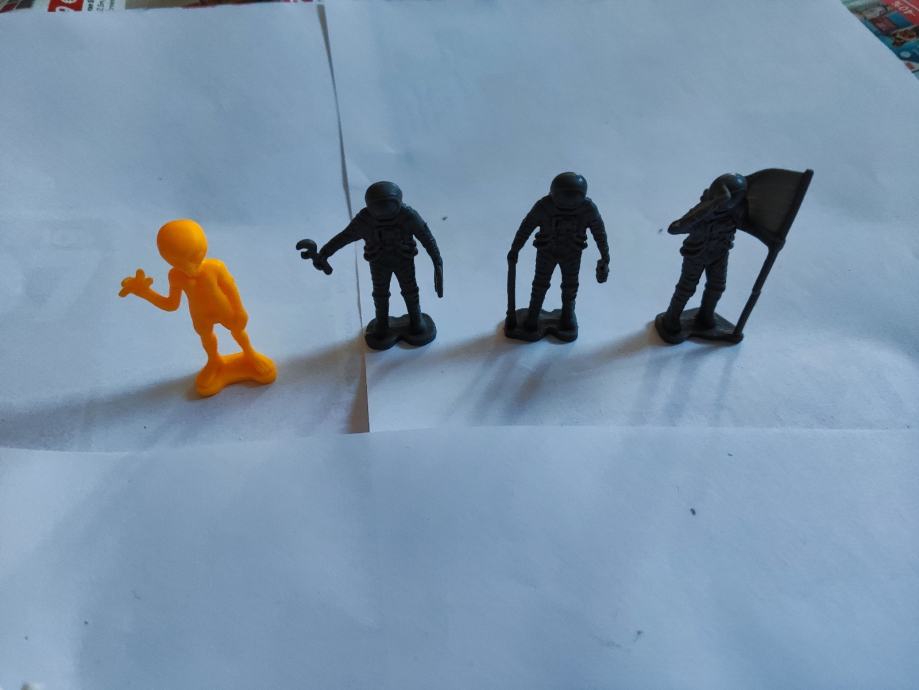 Prodajem set malih plastičnih figura s temom svemira i astronauta. U setu se nalazi više figurica, uključujući astronaute u svemirskim odijelima s detaljima kao što su kacige, alati i zastava. Figurice su različitih boja - ima narančastih i sivih. Visina figura je otprilike standardna za ovakav tip igračaka. Zanimljiv dodatak dječjoj kolekciji ili za igru.