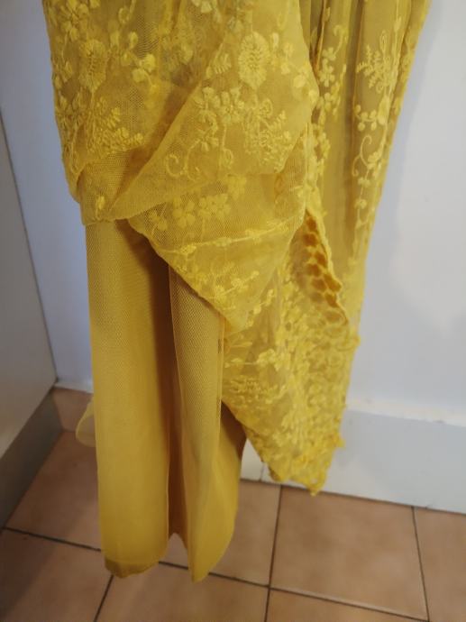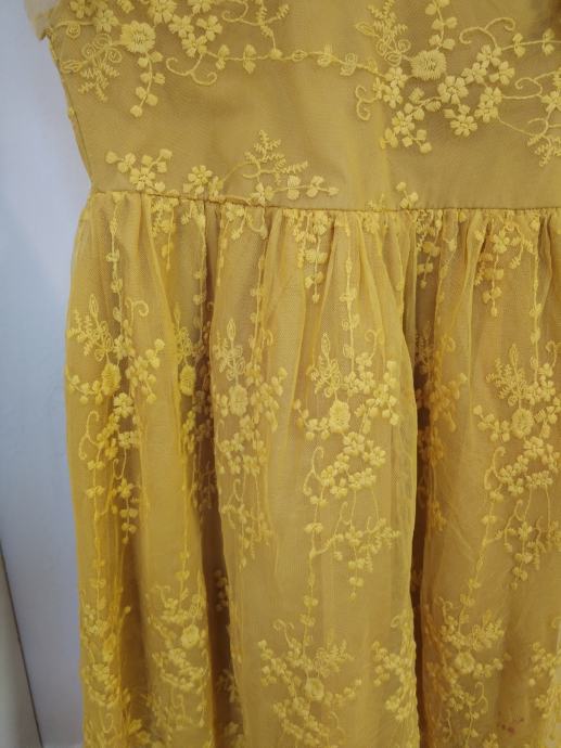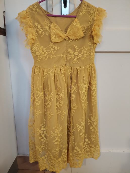 Prodajem, malo nošenu, žutu haljinicu od žakardiranog žutog tila, 140, NNJXD. Haljinica se otraga zatvara dugim zatvaračem, ima mašnu na vrhu, a ispod je podstavljena! Pogledajte ostale moje svečane haljinice! Hvala...
