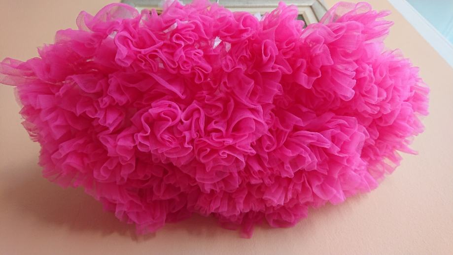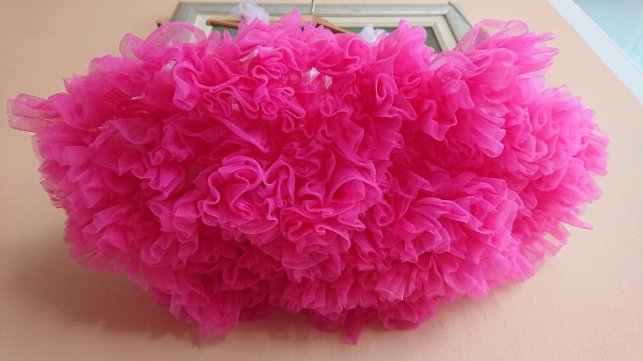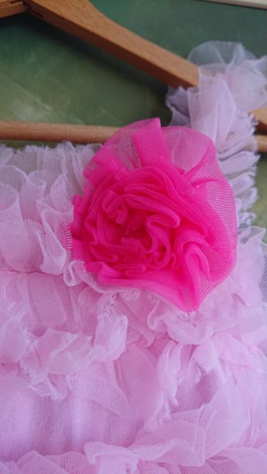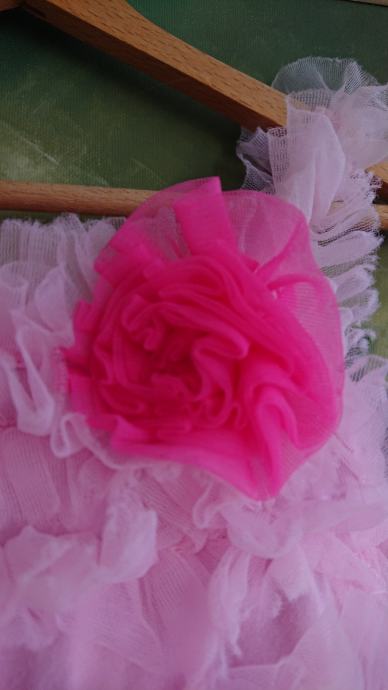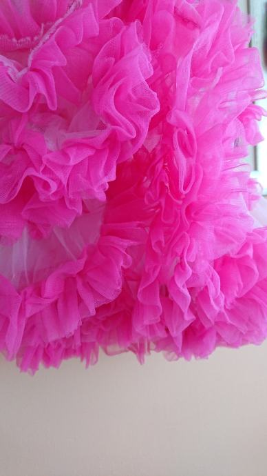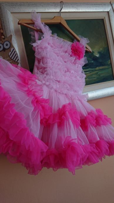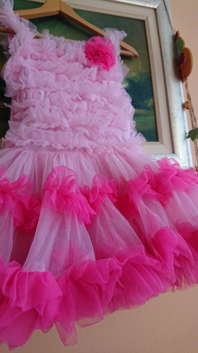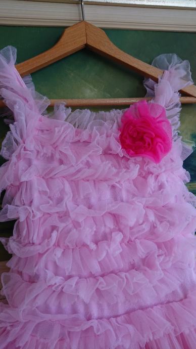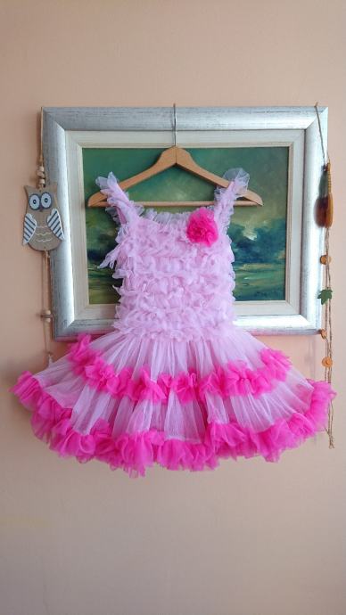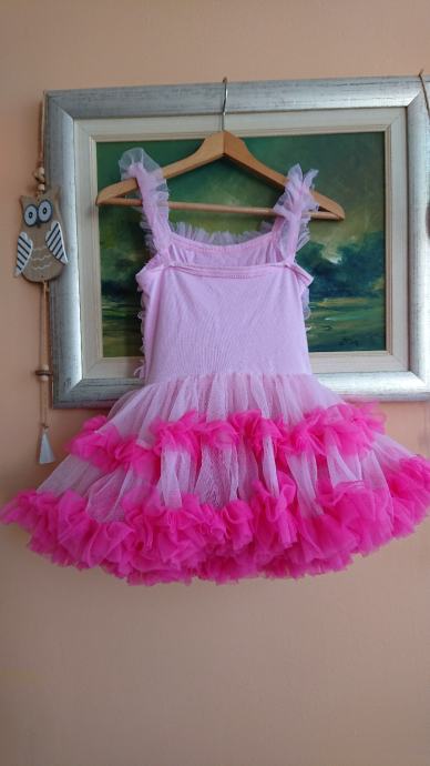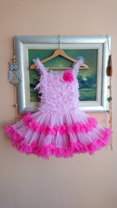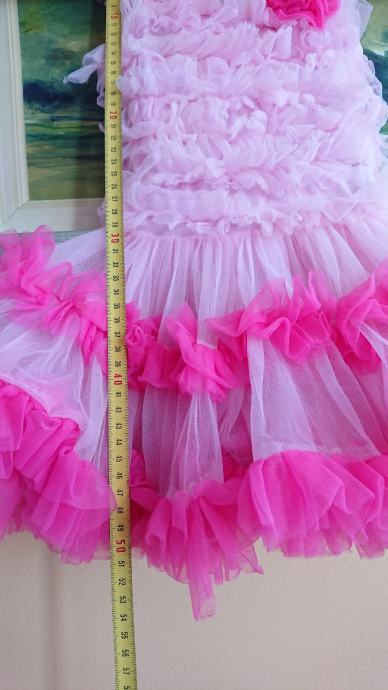 Predivna roza haljina sa jako puno slojeva tila, br. 104 / 110, koja se jaaako vrti, što je curkama itekako bitno, zvonolika, ukupna dužina cca 50cm, sa cvjetićem naprijed, pretežno roze boje, preslatko stoji, super za rođendane i slične proslave, ili za plesne nastupe.