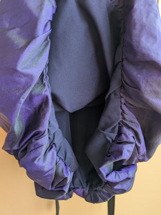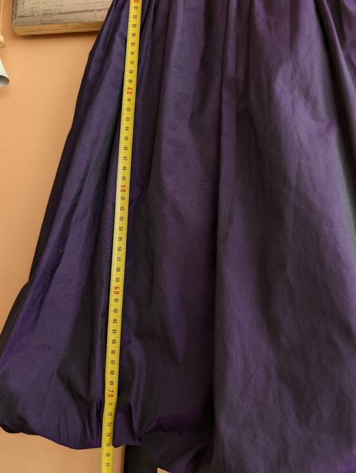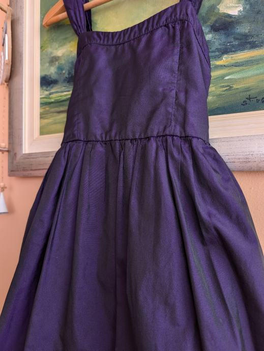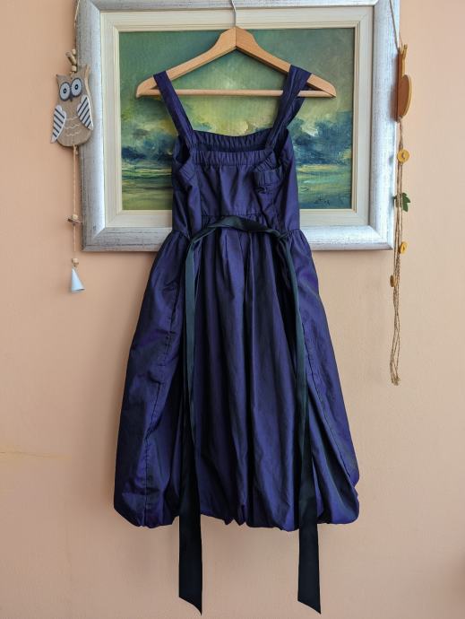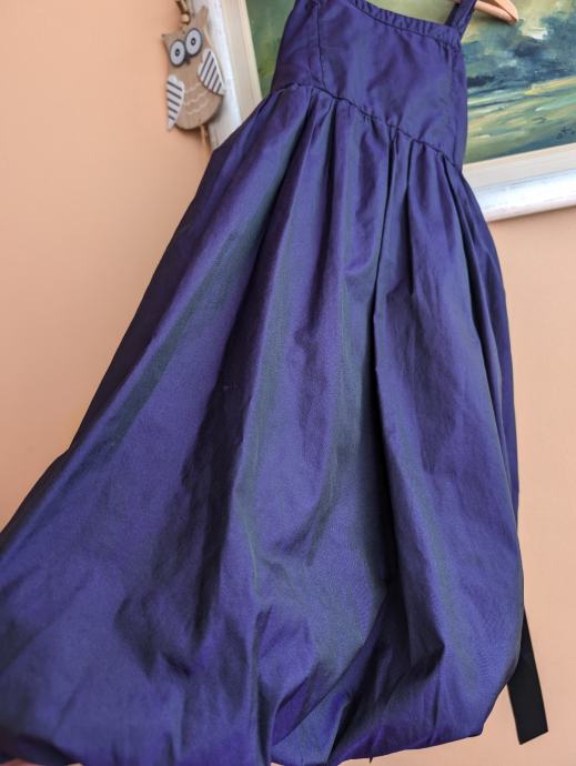 Predivna haljina br. 140 za djevojčice, vrlo posebna, jako lijepo stoji, boja se presijava iz ljubičaste u crnu, a može se svezati i mašnica otraga, sva je pufasta pri dnu (vidjeti slike), dužina je uslikana.
