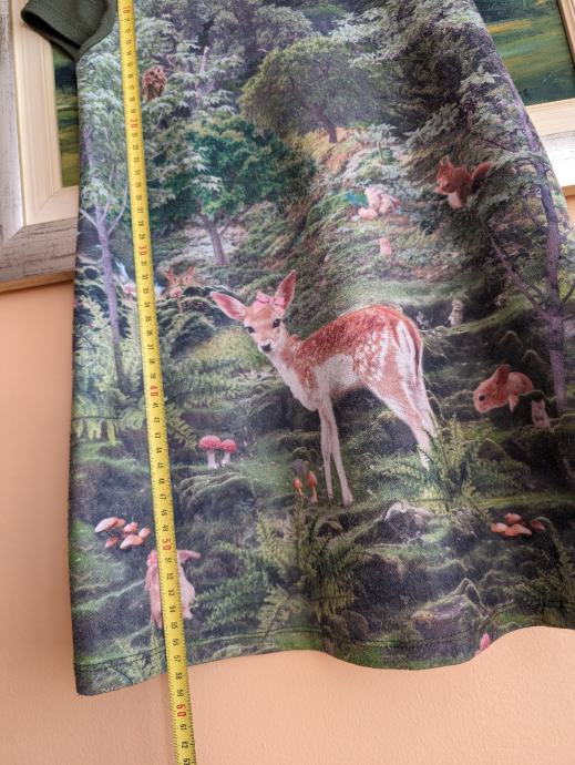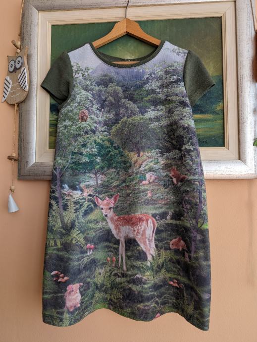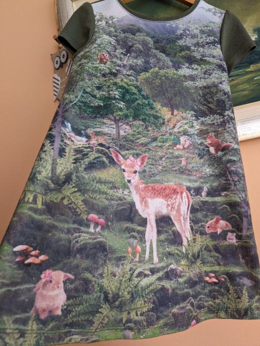 - jedna pretežno tamnozelene boje, sa raznim šumskim životinjama (vjeverica, srna, sova, zeko), vrlo posebna - hit među djecom, može se nositi kao haljina i kasnije kao tunika;