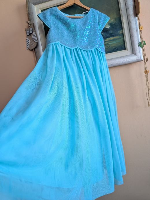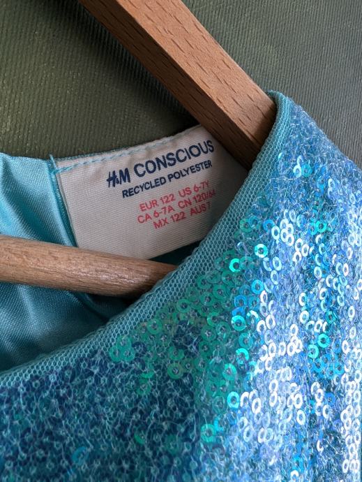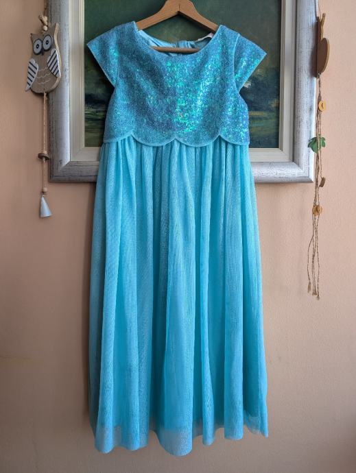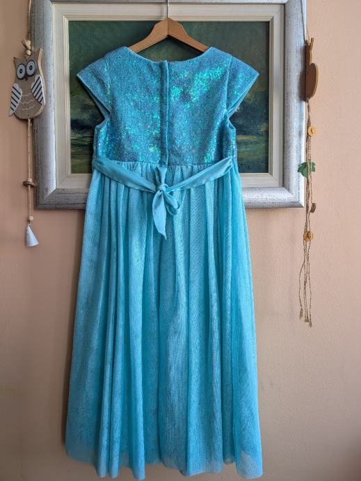 Predivna haljina za djevojčice br. 122, marka H&M, ima svjetlucave detalje pa podsjeća na malu sirenu, svečana, sa dva sloja tila i svilenom podstavom, s mašnicom otraga, dužina je uslikana (cca 80 cm sve skupa s tilom), kopčanje otraga na cif.