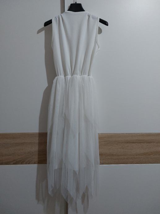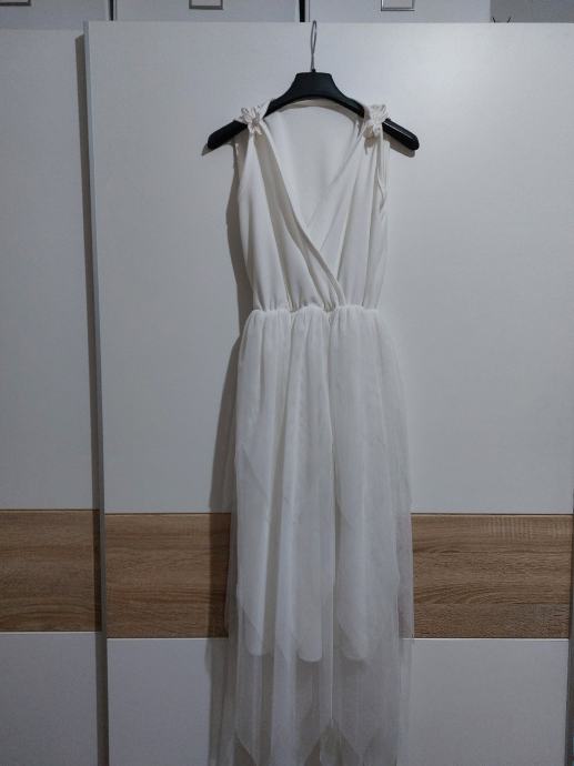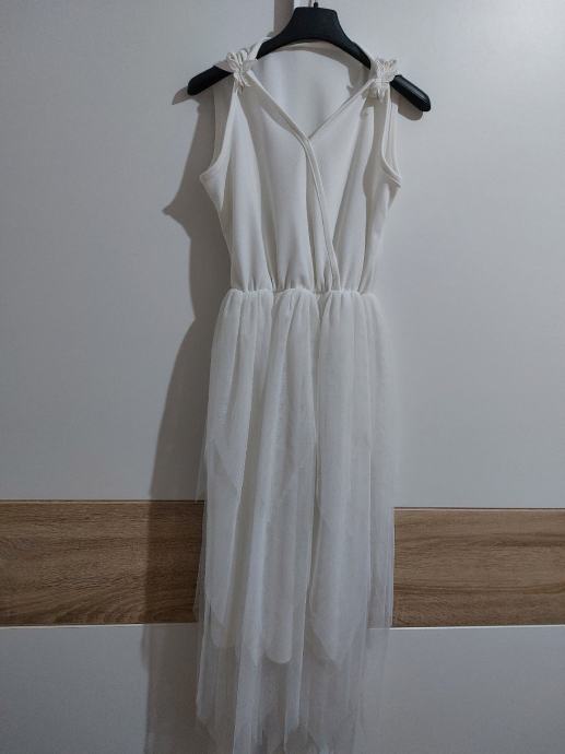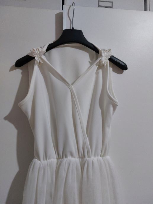 Bijela nova haljina. Kupljena za Prvu pričest. Gornji dio elastin prilagodljiv za vise visina. Mi smo dodali masnicu ali može se i skinuti pa je onda o obična gore i moze se kombinirati na razne načine. Trenutno mi ne da da stavim sliku ali ako netko želi vidjeti , šaljem na viber.