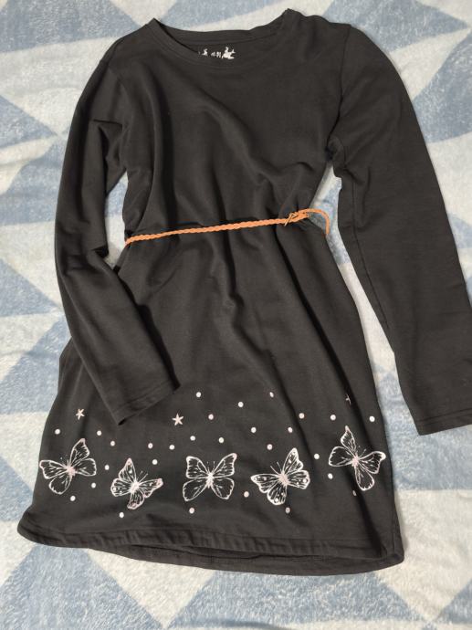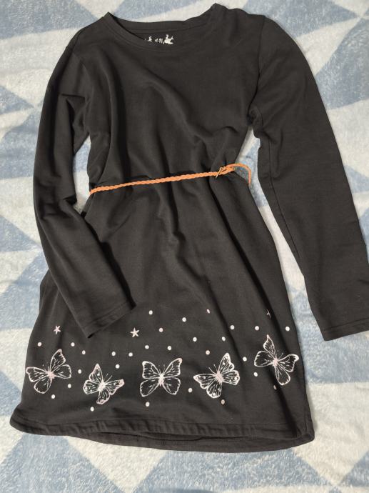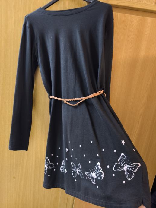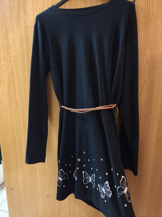 Haljina tunika, lijepe crne boje, na nekim slikama je blijeda od kamere, s pripadajućim remenom, dvaput nošena, dijete odmah preraslo, kao nova, ugodan pamuk. Dužina 83, širina 44, rastezljiva je.