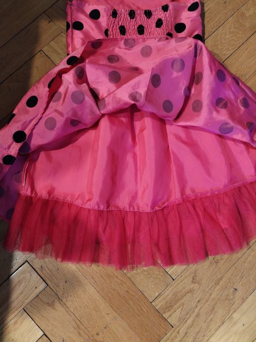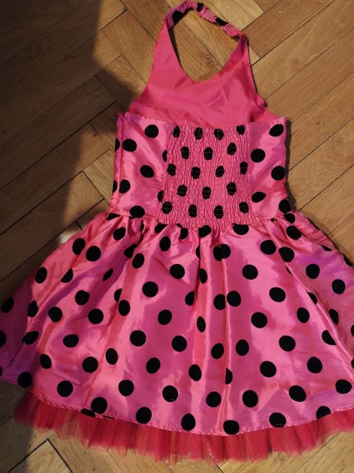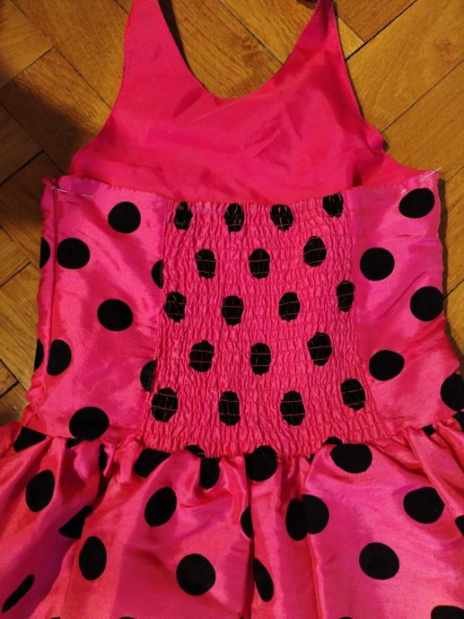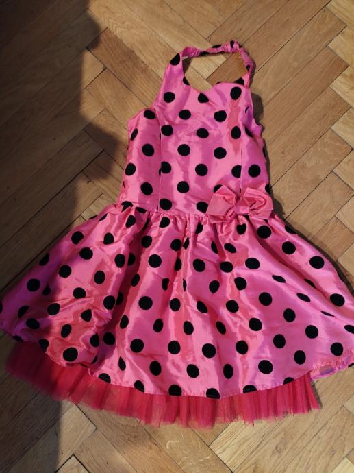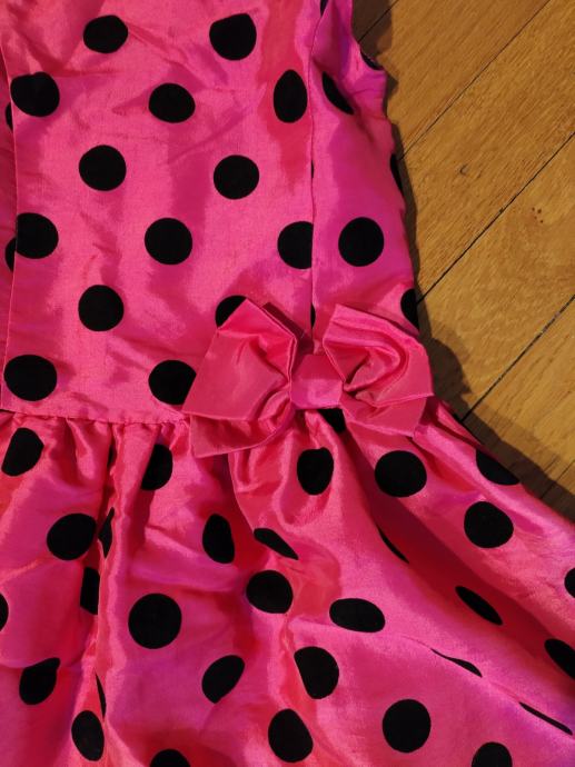 Prodajem efektnu dječju haljinicu u pinki boji s crnim točkama. Haljinica ima otvorena leđa, a jedna naramenica ide oko vrata. haljinica je podstavljena, na leđima je široka guma pa se može podesiti i za jače dijete. Zatvara se sa strane većim zatvaračem.