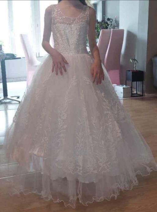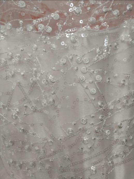 Jednom nošena za prvu pričest. Dodatak uz haljinu u kompletu mašna sa palietama. Uživo haljina raskošnija i cijela se presijava od šljokica i palieta. Obruč ušiven. Više slojeva tila na doljnem djelu. Kemijsko očišćena.