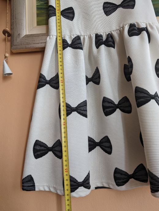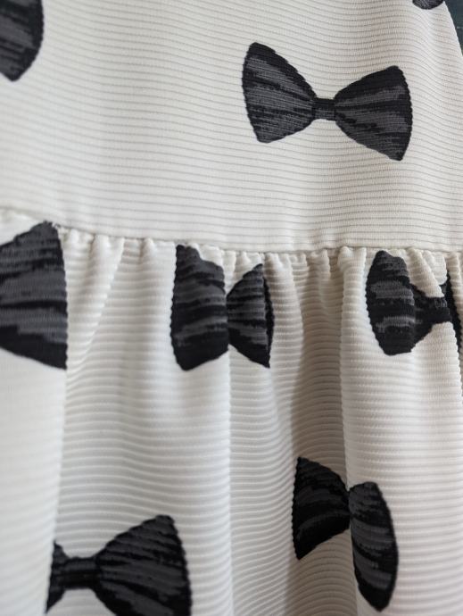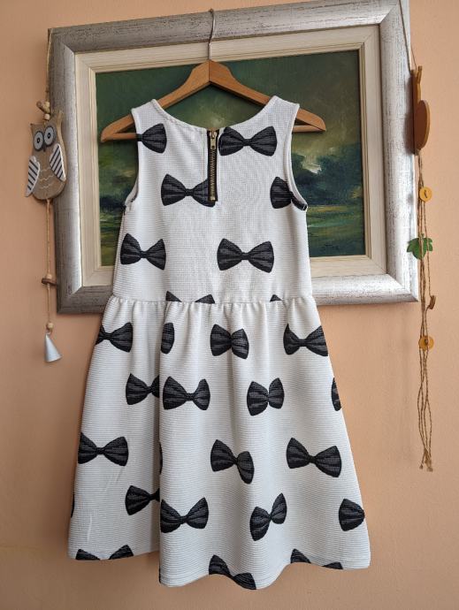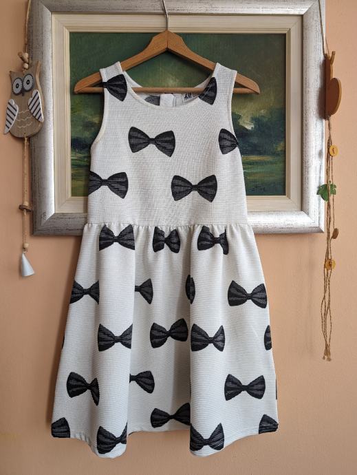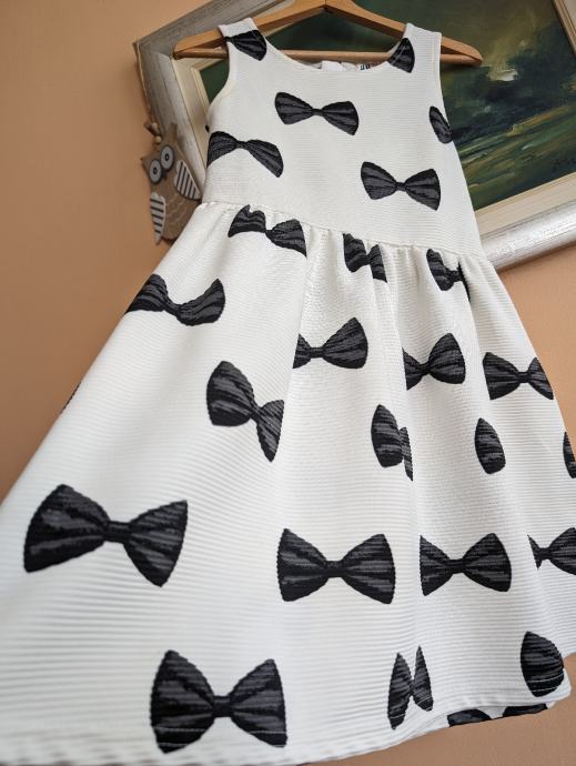 Svečana haljina za djevojčice br. 122 128, marka H&M, dužina je uslikana, crno bijele boje s motivom mašnica, nosiva cijelu godinu, jako slatko stoji, ugodna za nositi, kvalitetan materijal, vrlo posebna.