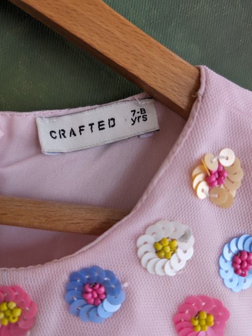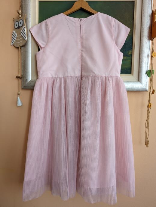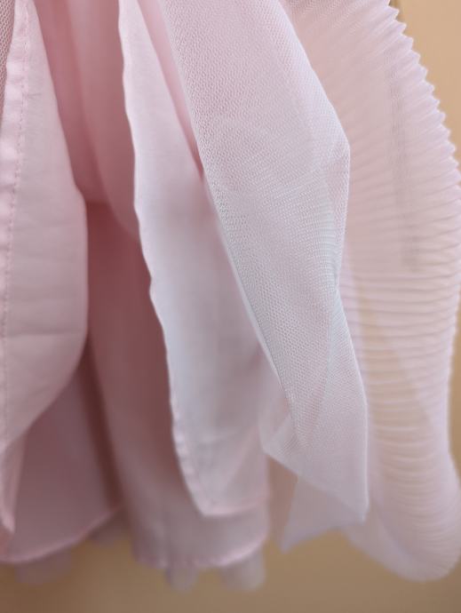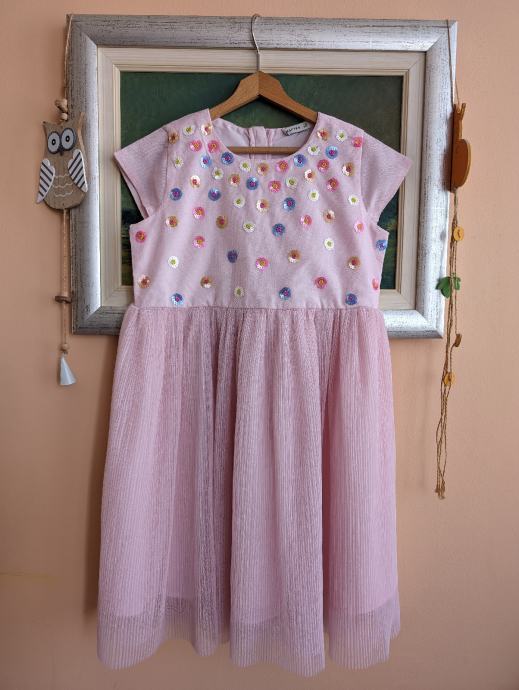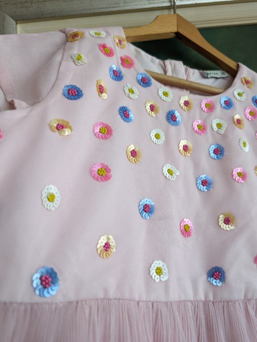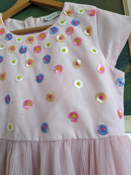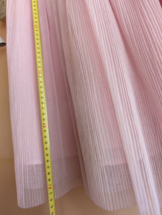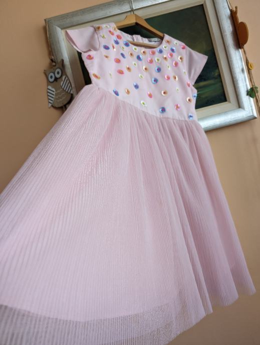 Svečana haljina za djevojčice br. 122 / 128, dužina je uslikana, pretežno roze boje, s motivom šarenih cvjetića, s par slojeva tila, jako slatko stoji, za posebne prilike ili ljetne šetnje.