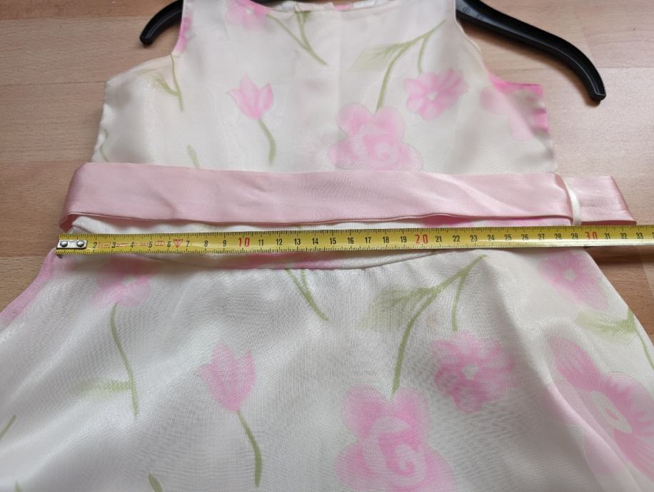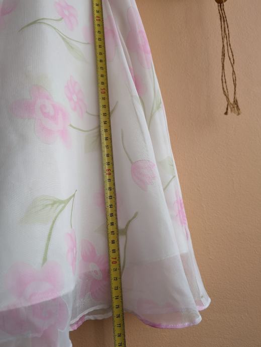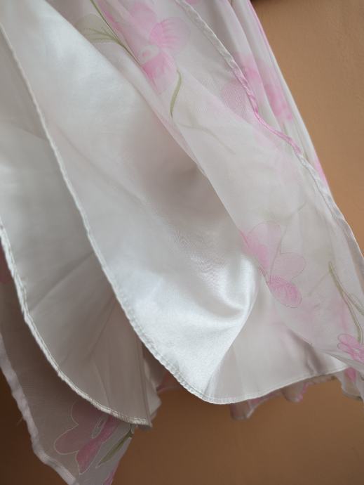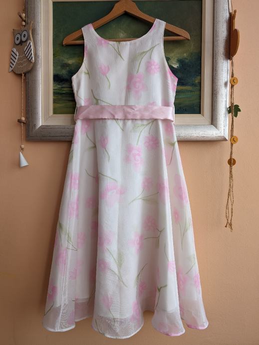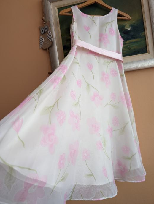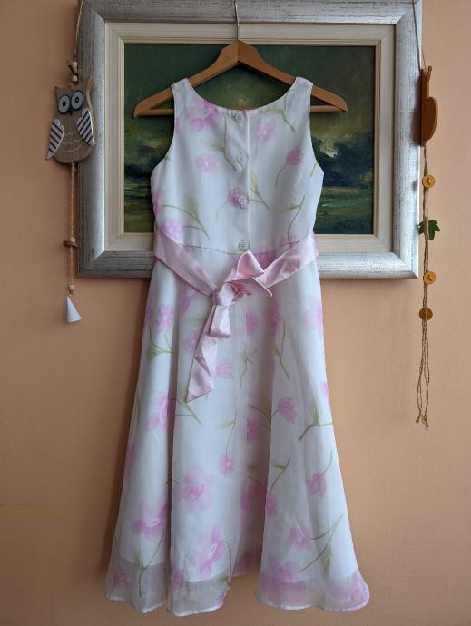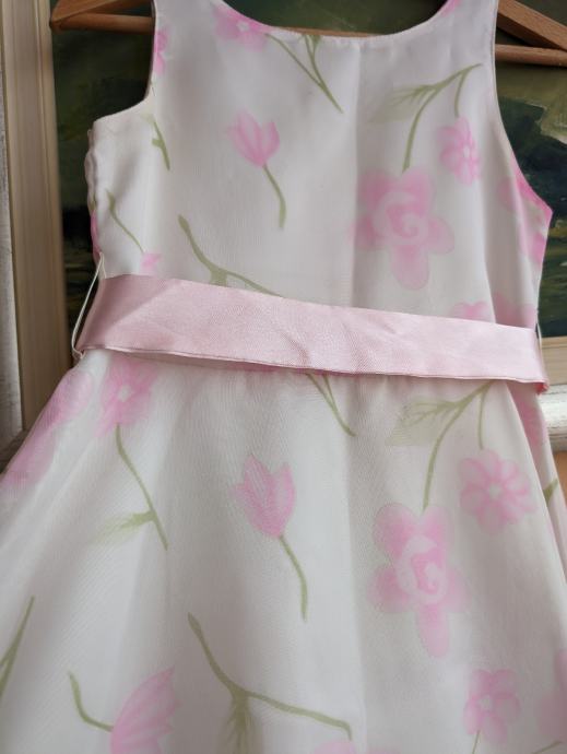 Svečana haljina za curice br. 122, pretežno bijele i svijetlo roze boje, sa motivima cvijeća, kopčanje otraga na gumbiće.