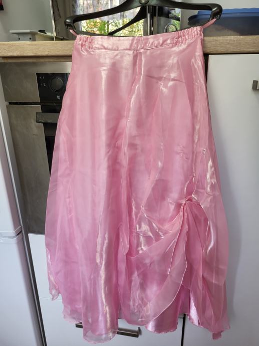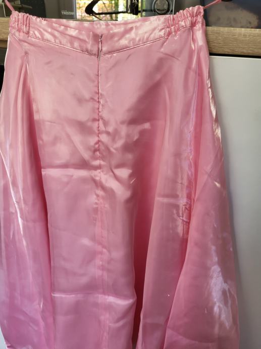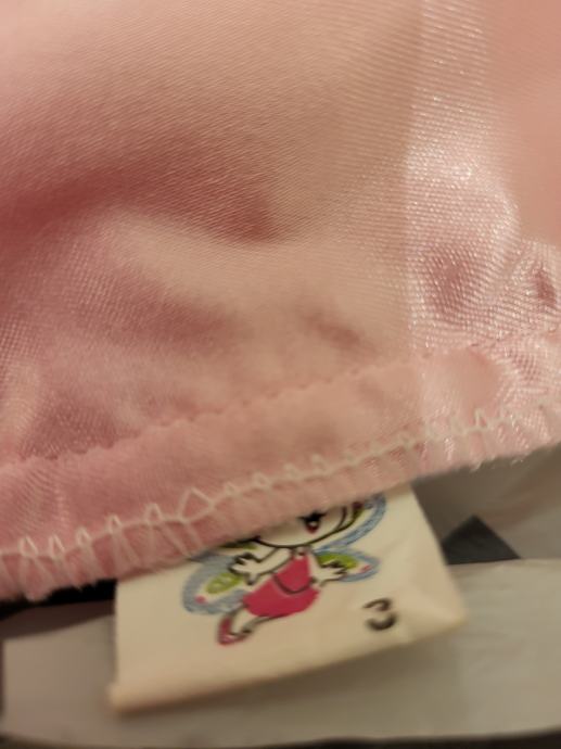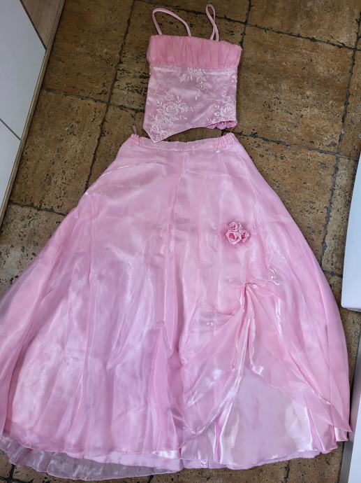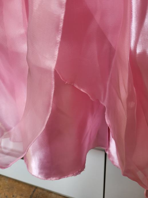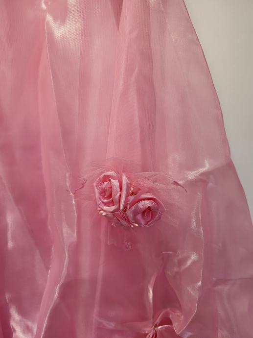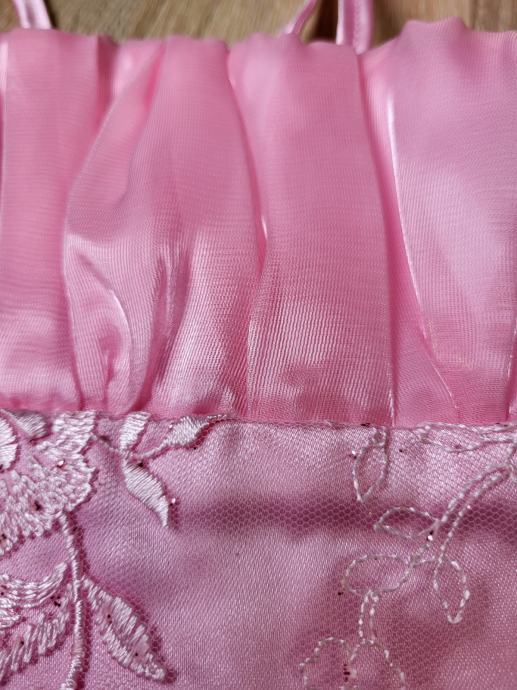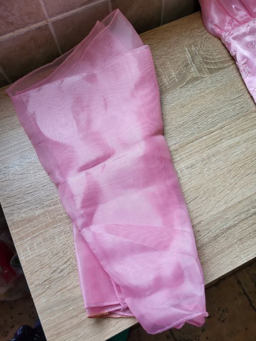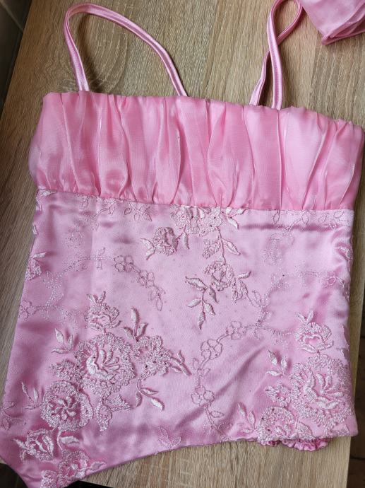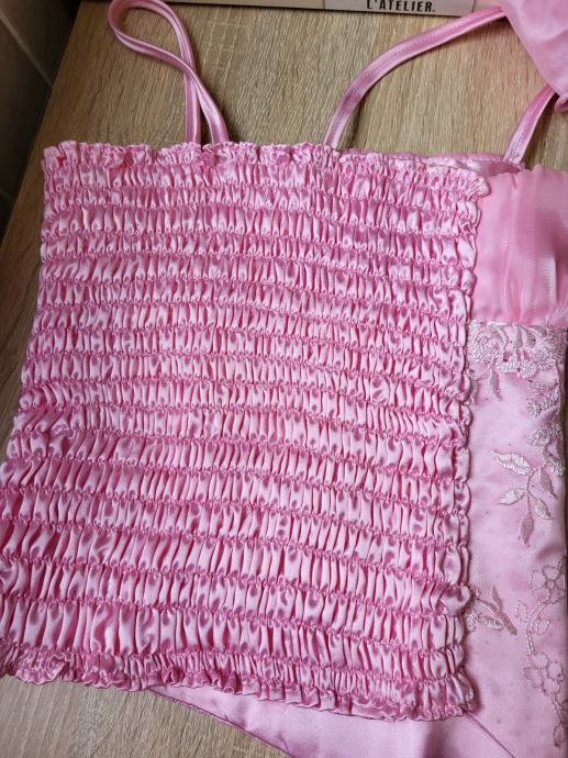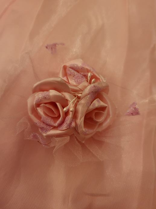 Prodajem jednom obučenu svečanu roza haljinicu (kćer je nosila za Svetu Pričest), vel. 9 godina. Boja roza, materijal: gornji dio naprijed ima svilu, til, iza je guma tako da se lako da prilagoditi tijelu, mjere: dužina naramenica 13cm, dužina gornjeg dijela 27,5cm, širina 27cm.